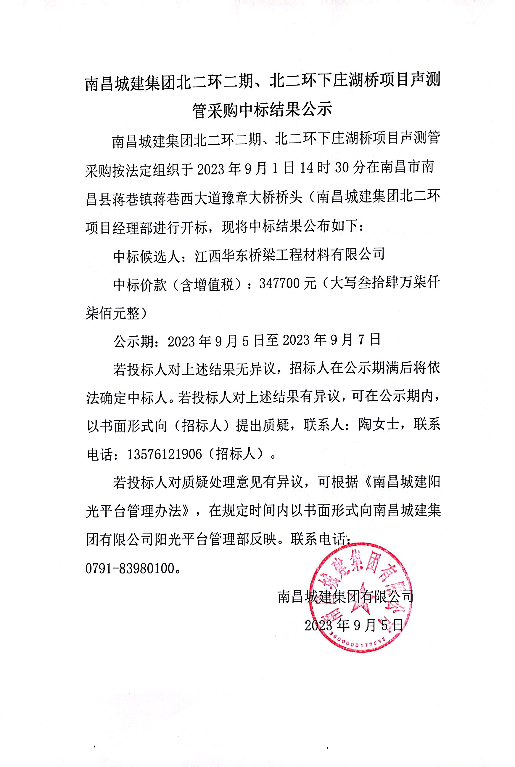 必赢亚州242.net集团北二环二期、北二环下庄湖桥项目声测管采购按法定组织于2023年9月1日14时30分在南昌市南昌县蒋巷镇蒋巷西大道豫章大桥桥头(必赢亚州242.net集团北二环项目经理部进行开标,现将中标结果公布如下: