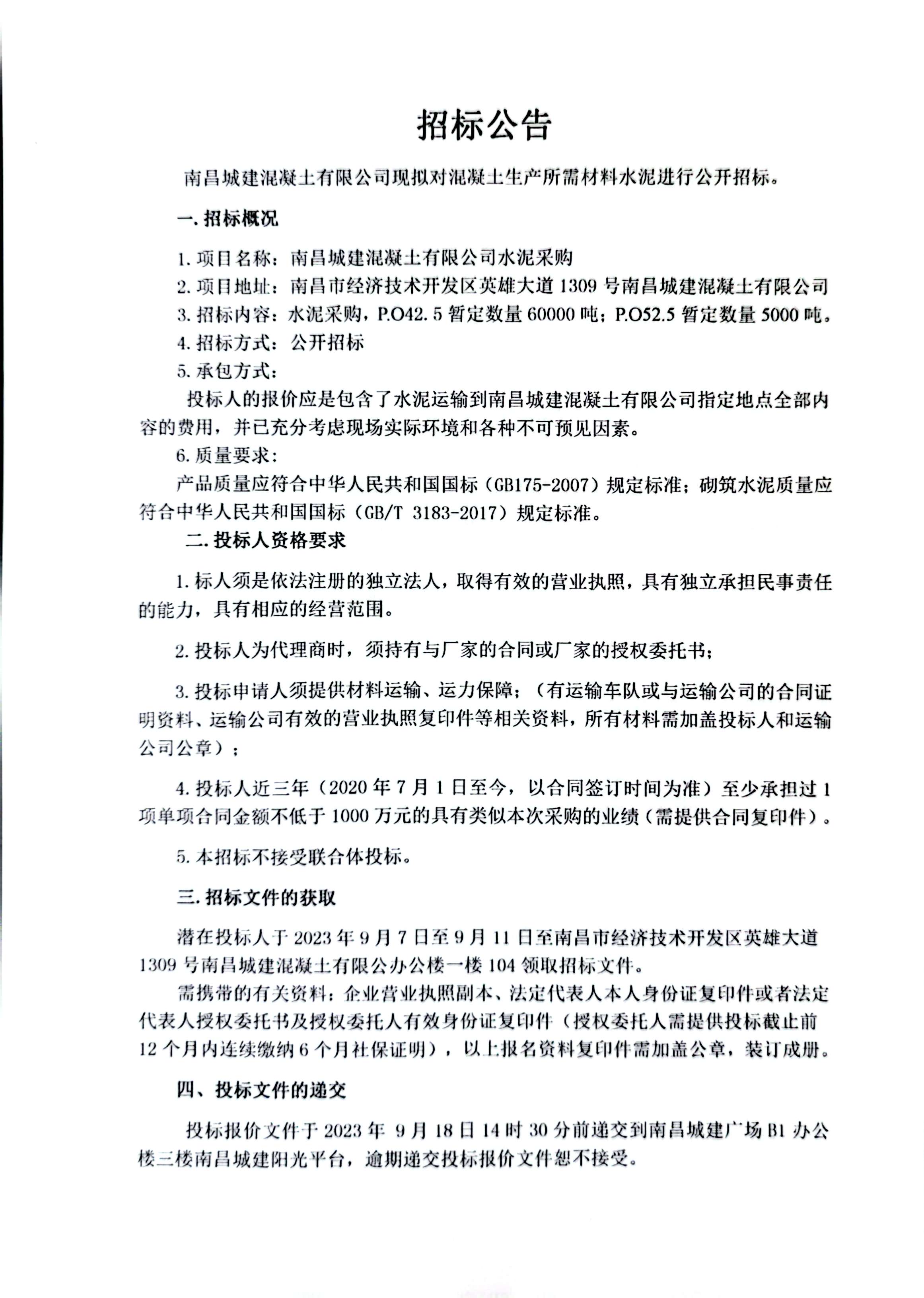 必赢亚州242.net混凝土有限公司现拟对混凝土生产所需材料水泥进行公开招标。
