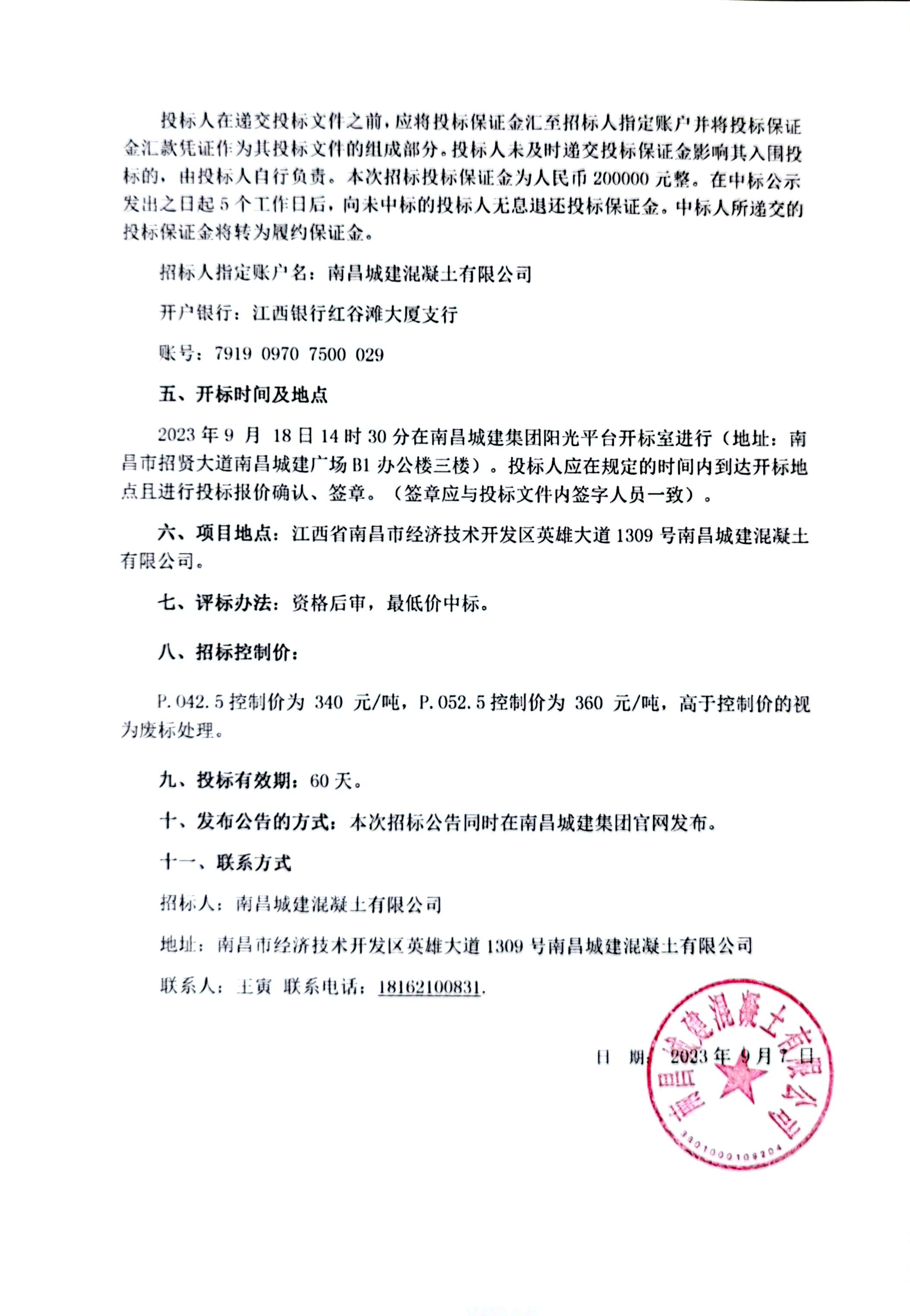 潜在投标人于2023年9月7日至9月11日至南昌市经济技术开发区英雄大道1309号必赢亚州242.net混凝土有限公办公楼一楼104领取招标文件。