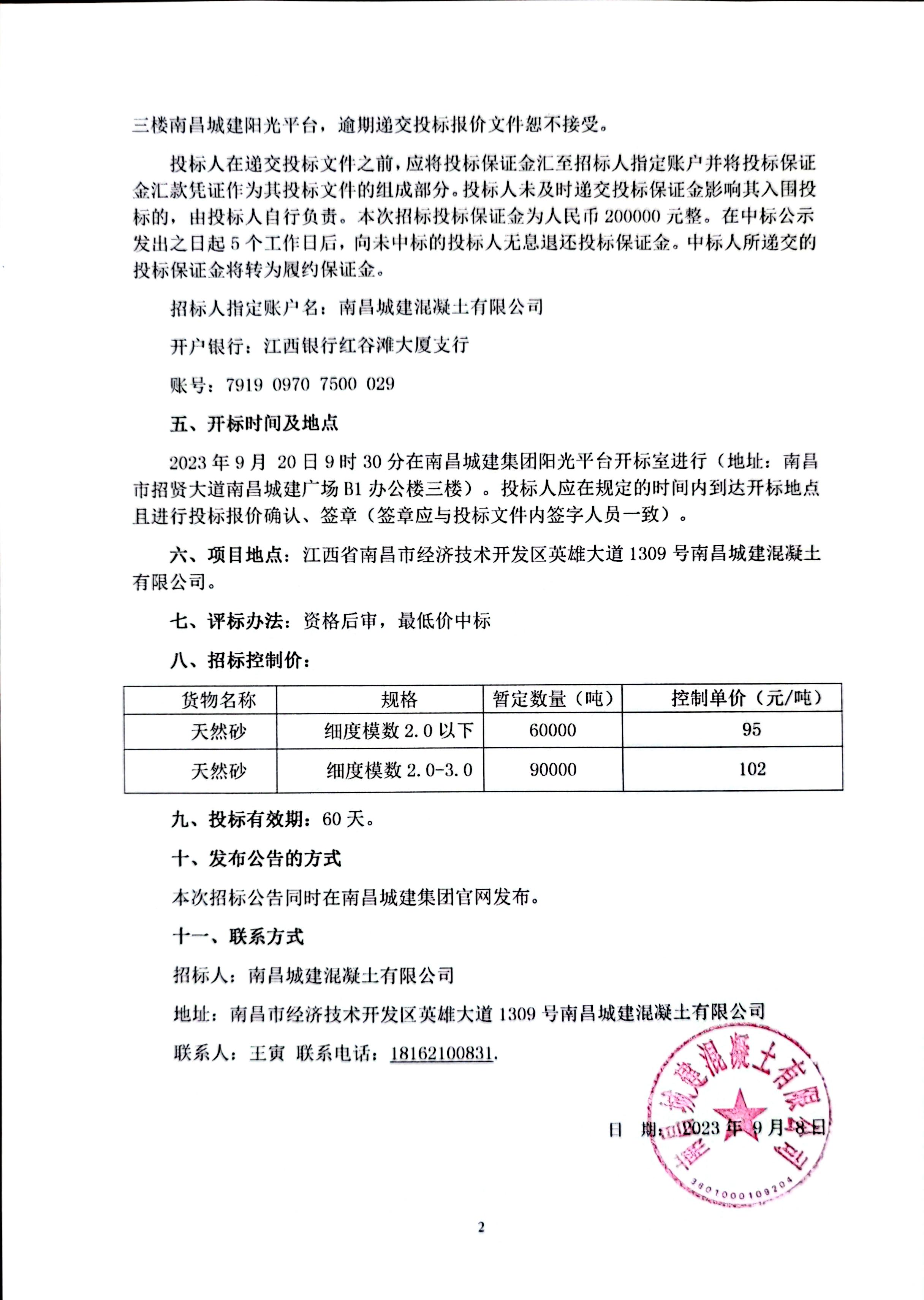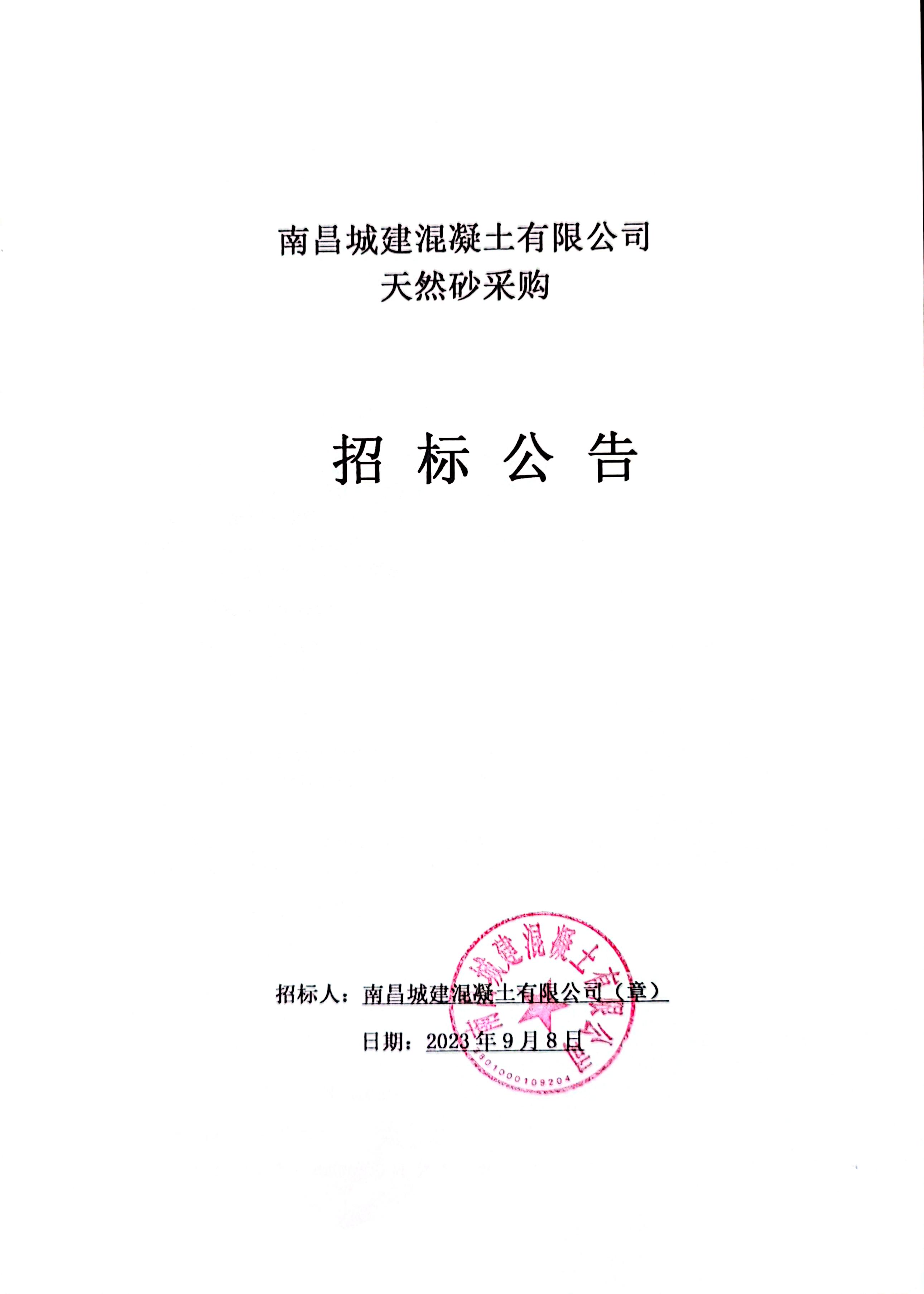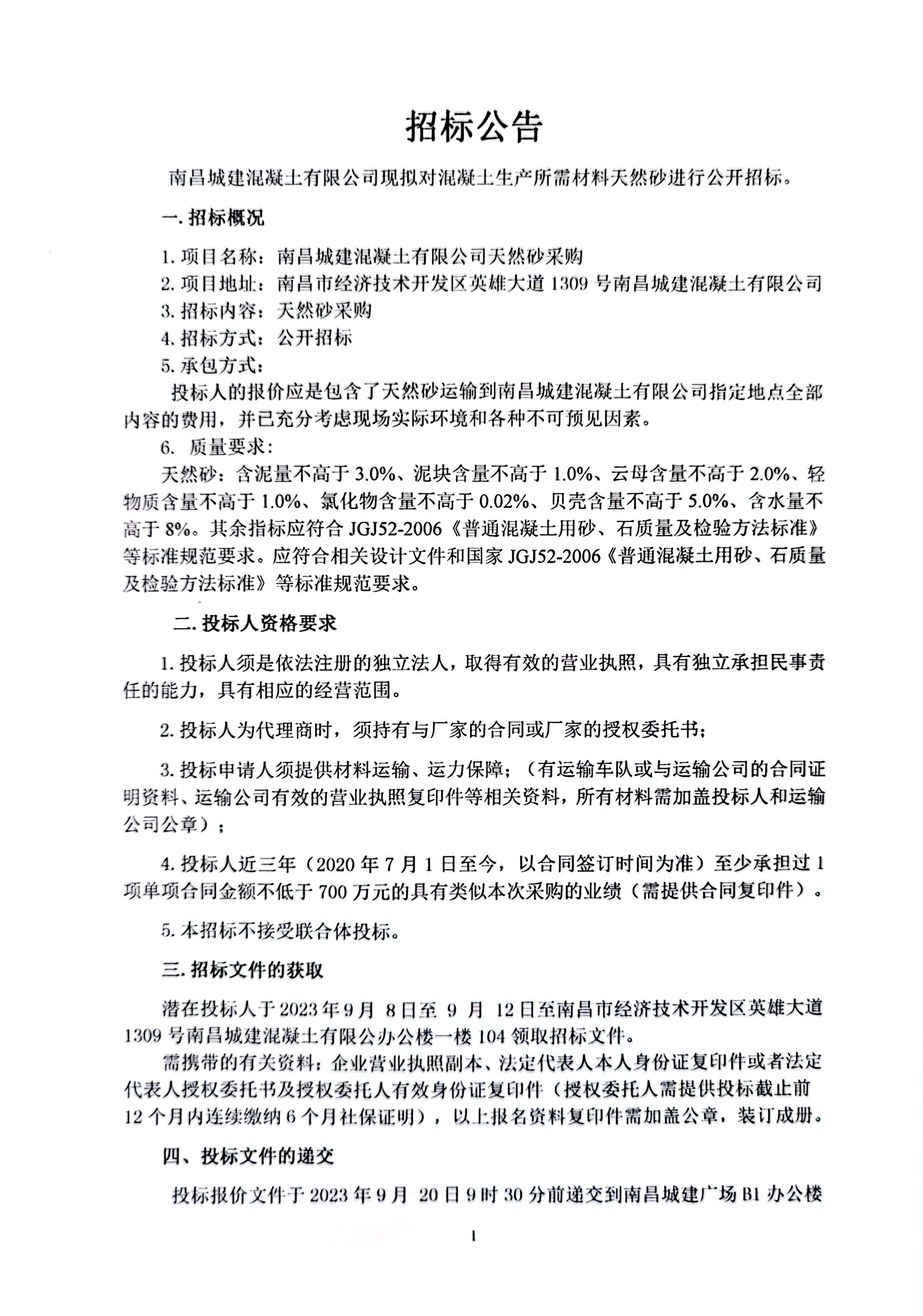 必赢亚州242.net混凝土有限公司现拟对混凝土生产所需材料天然砂进行公开招标。