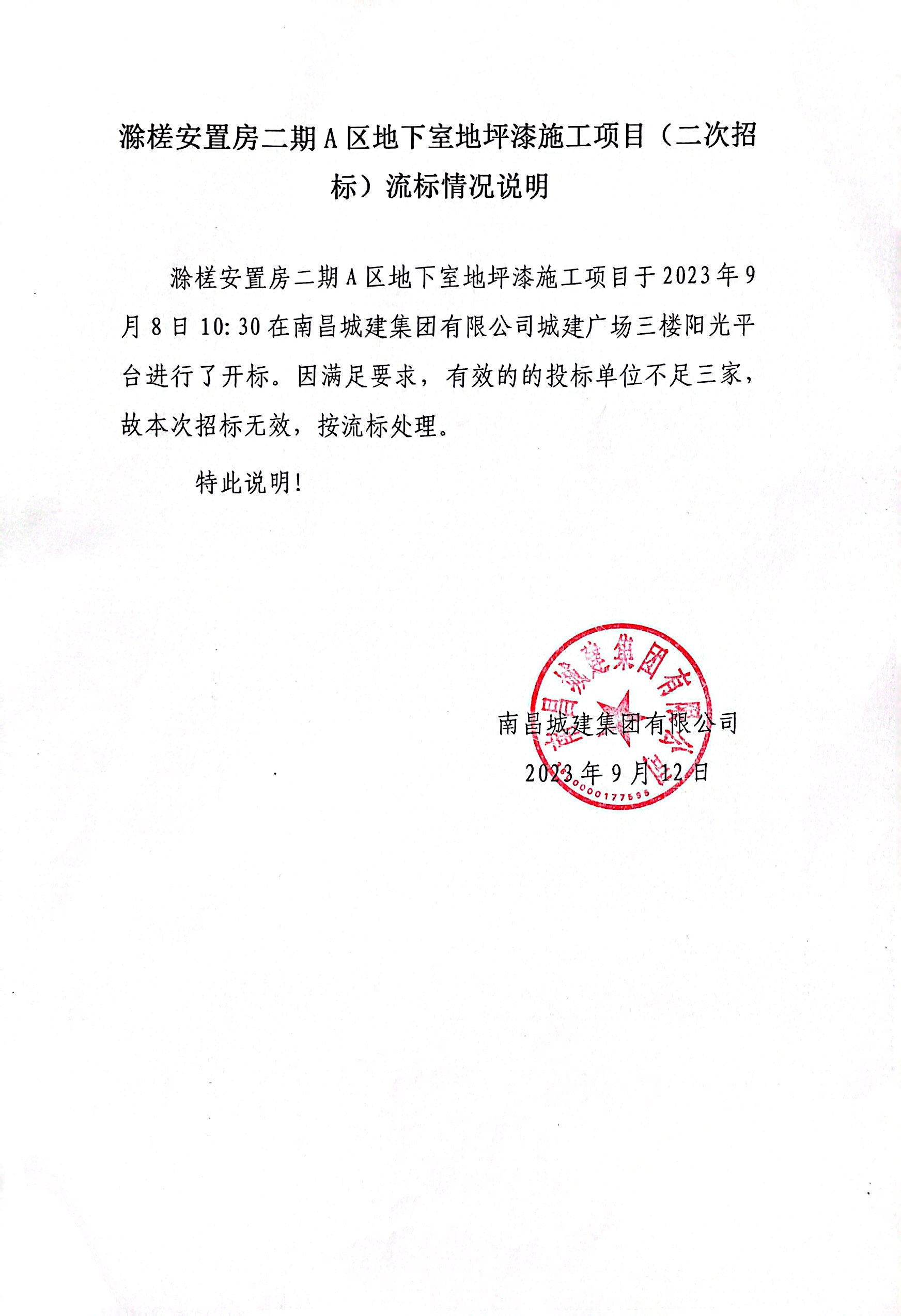 滁槎安置房二期A区地下室地坪漆施工项目于2023年9月8日10:30在必赢亚州242.net集团有限公司城建广场三楼阳光平台进行了开标。因满足要求,有效的的投标单位不足三家,故本次招标无效,按流标处理。