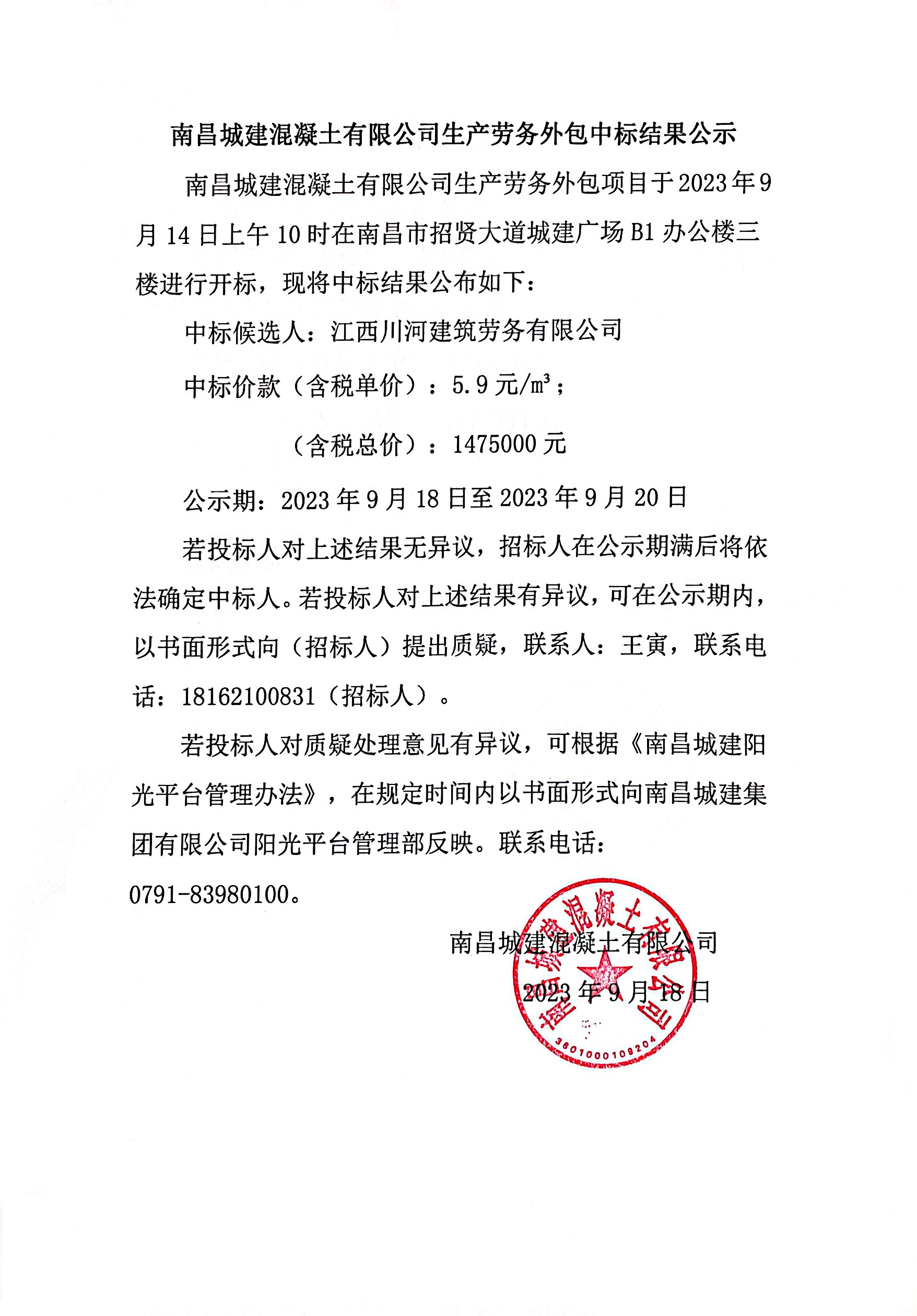 必赢亚州242.net混凝土有限公司生产劳务外包项目于2023年9月14日上午10时在南昌市招贤大道城建广场B1办公楼三楼进行开标,现将中标结果公布如下: