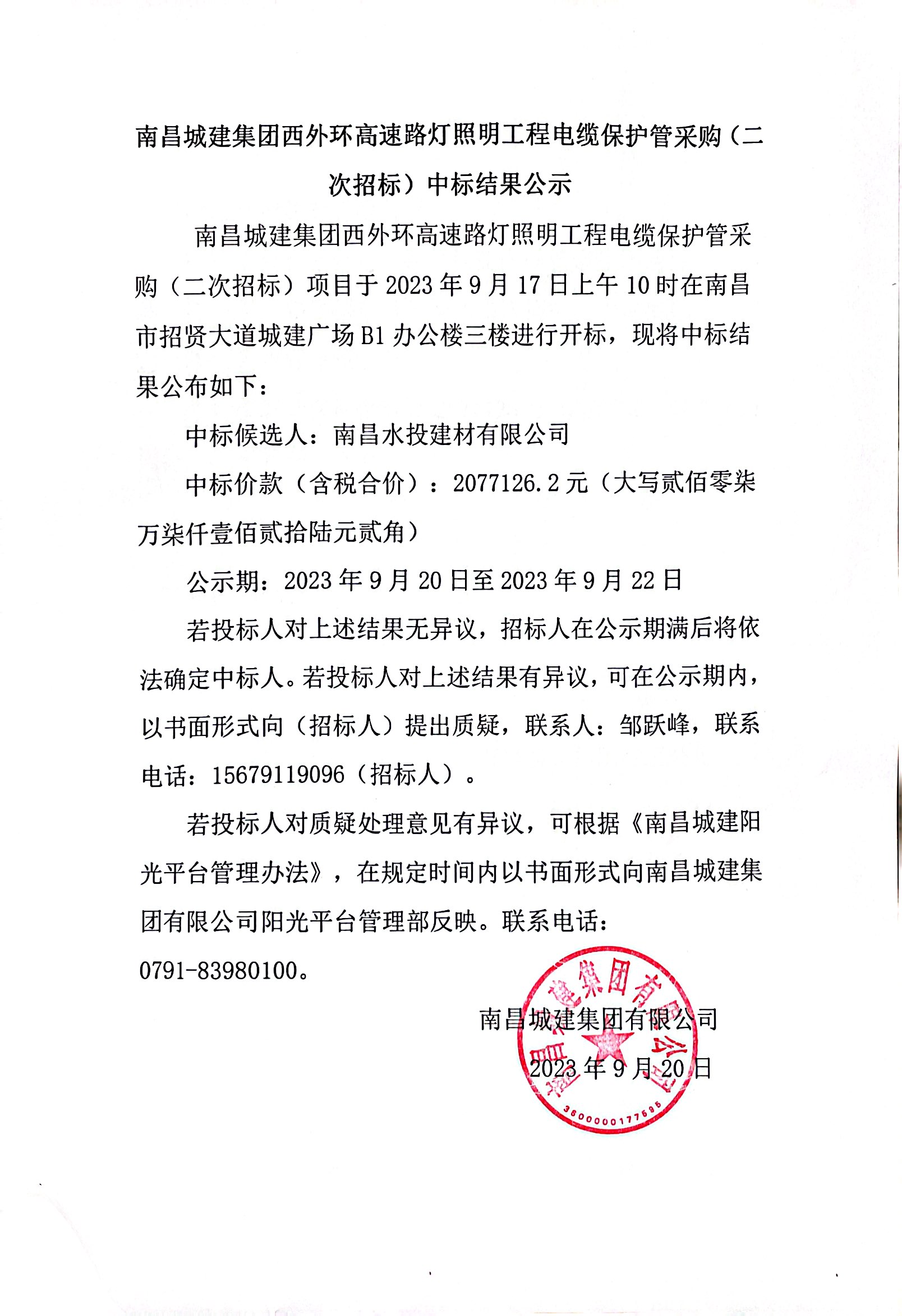 必赢亚州242.net集团西外环高速路灯照明工程电缆保护管采购(二次招标)项目于2023年9月17日上午10时在南昌市招贤大道城建广场B1办公楼三楼进行开标,现将中标结果公布如下: