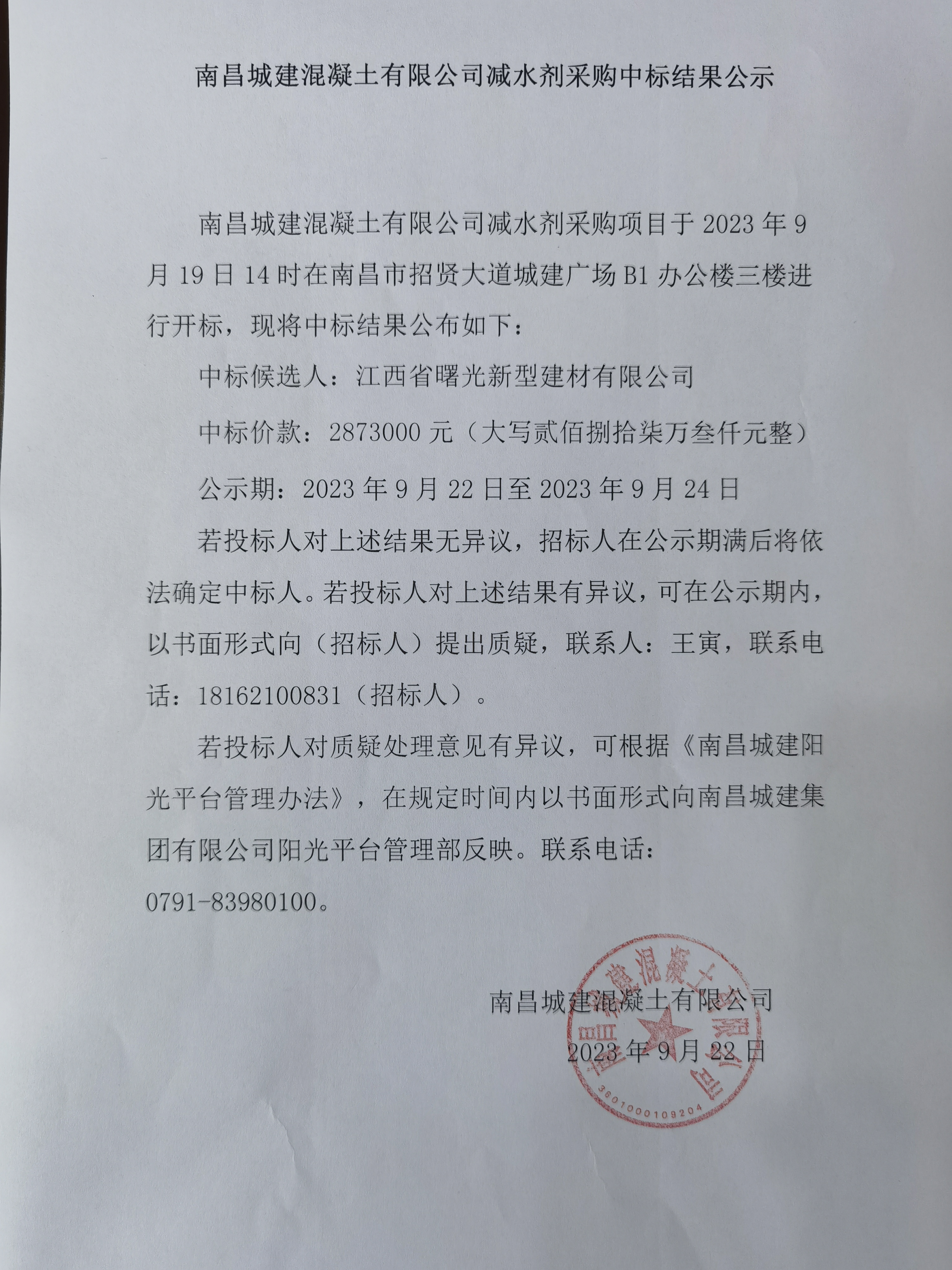 必赢亚州242.net混凝土有限公司减水剂采购项目于2023年9月19日14时在南昌市招贤大道城建广场B1办公楼三楼进行开标,现将中标结果公布如下: