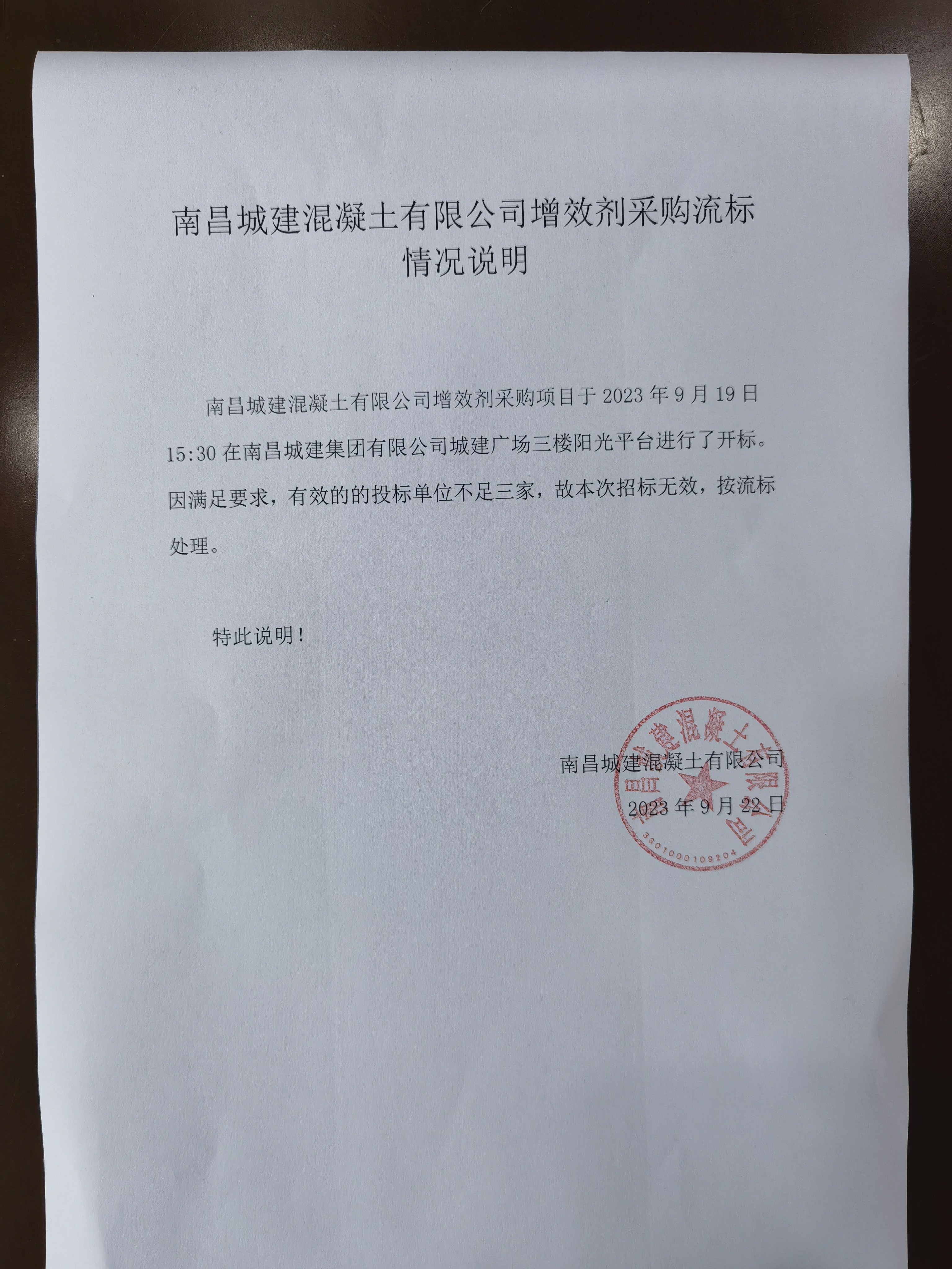 必赢亚州242.net混凝土有限公司增效剂采购项目于2023年9月19日15:30在必赢亚州242.net集团有限公司城建广场三楼阳光平台进行了开标。因满足要求,有效的的投标单位不足三家,故本次招标无效,按流标处理。