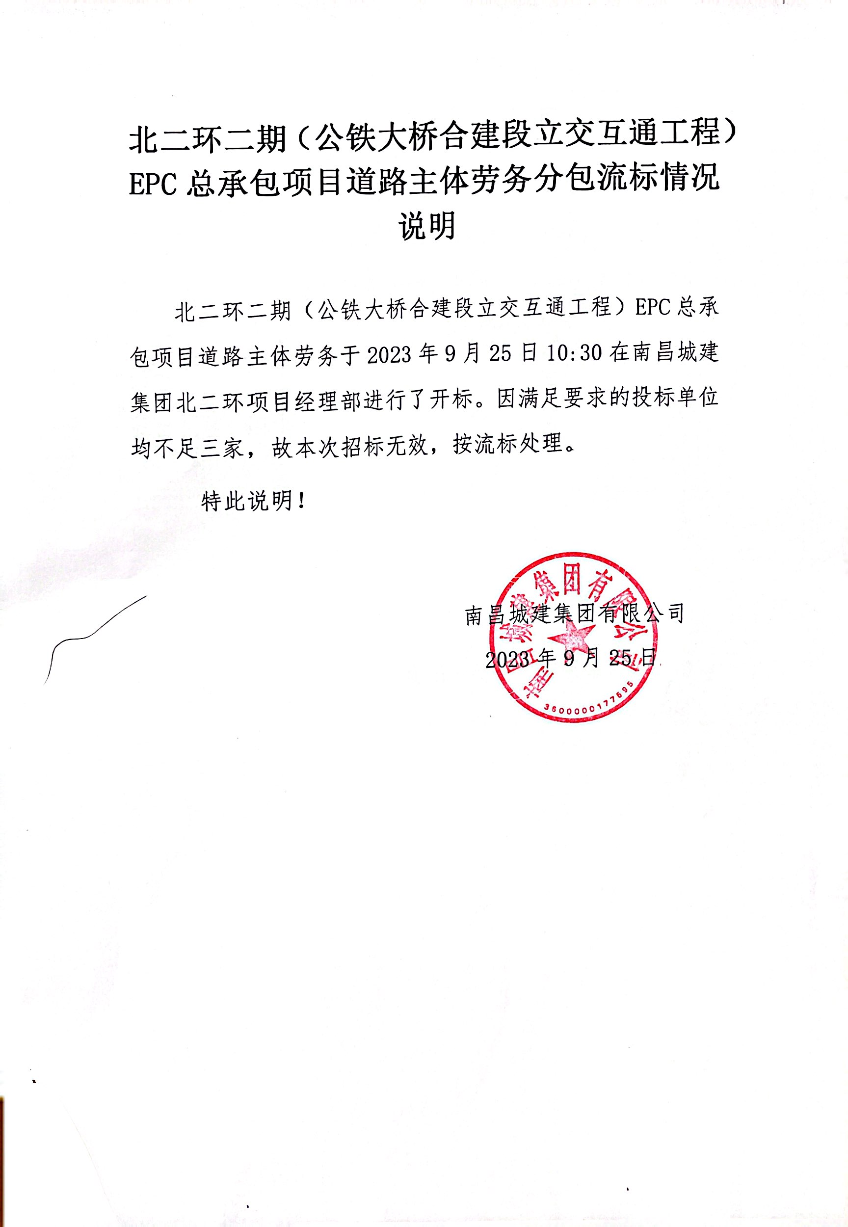 北二环二期(公铁大桥合建段立交互通工程)EPC总承包项目道路主体劳务于2023年9月25日10:30在必赢亚州242.net集团北二环项目经理部进行了开标。因满足要求的投标单位均不足三家,故本次招标无效,按流标处理。