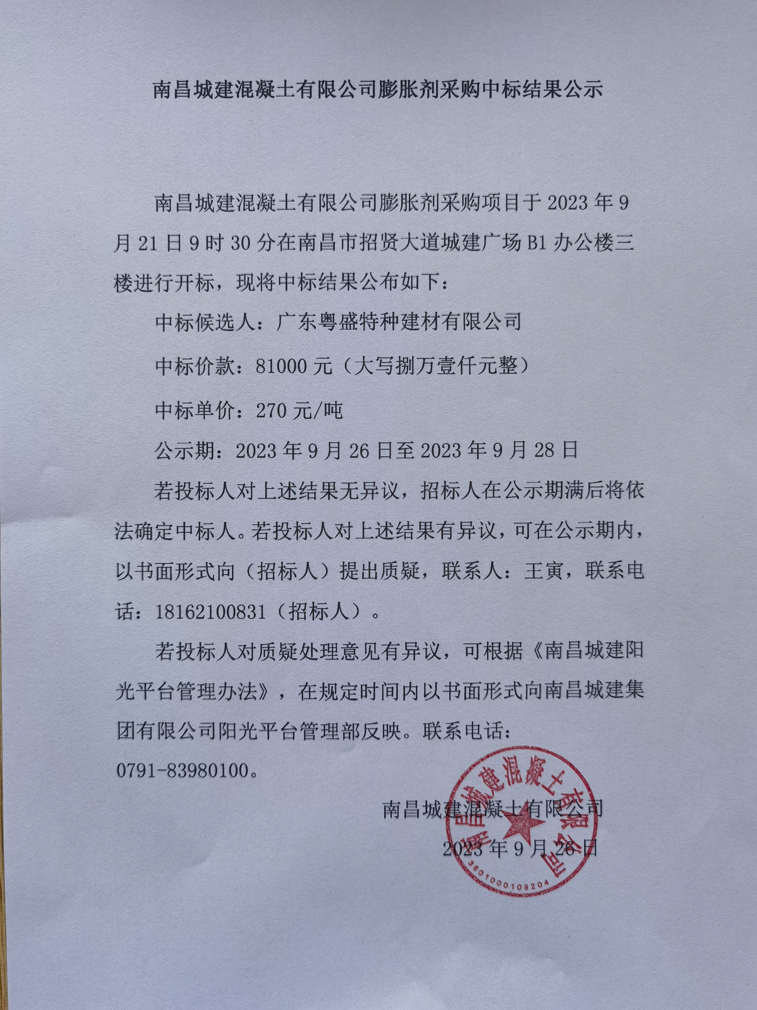 必赢亚州242.net混凝土有限公司膨胀剂采购项目于2023年9月21日9时30分在南昌市招贤大道城建广场B1办公楼三楼进行开标,现将中标结果公布如下: