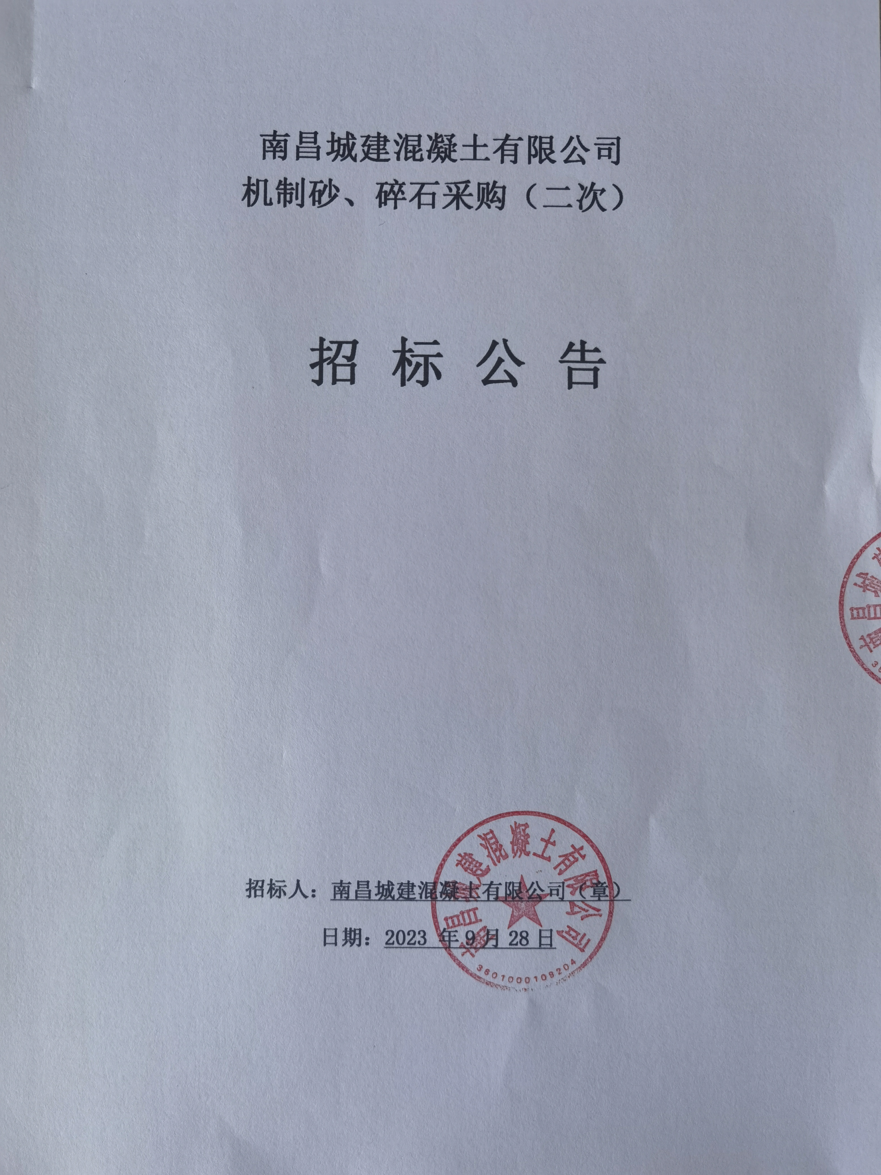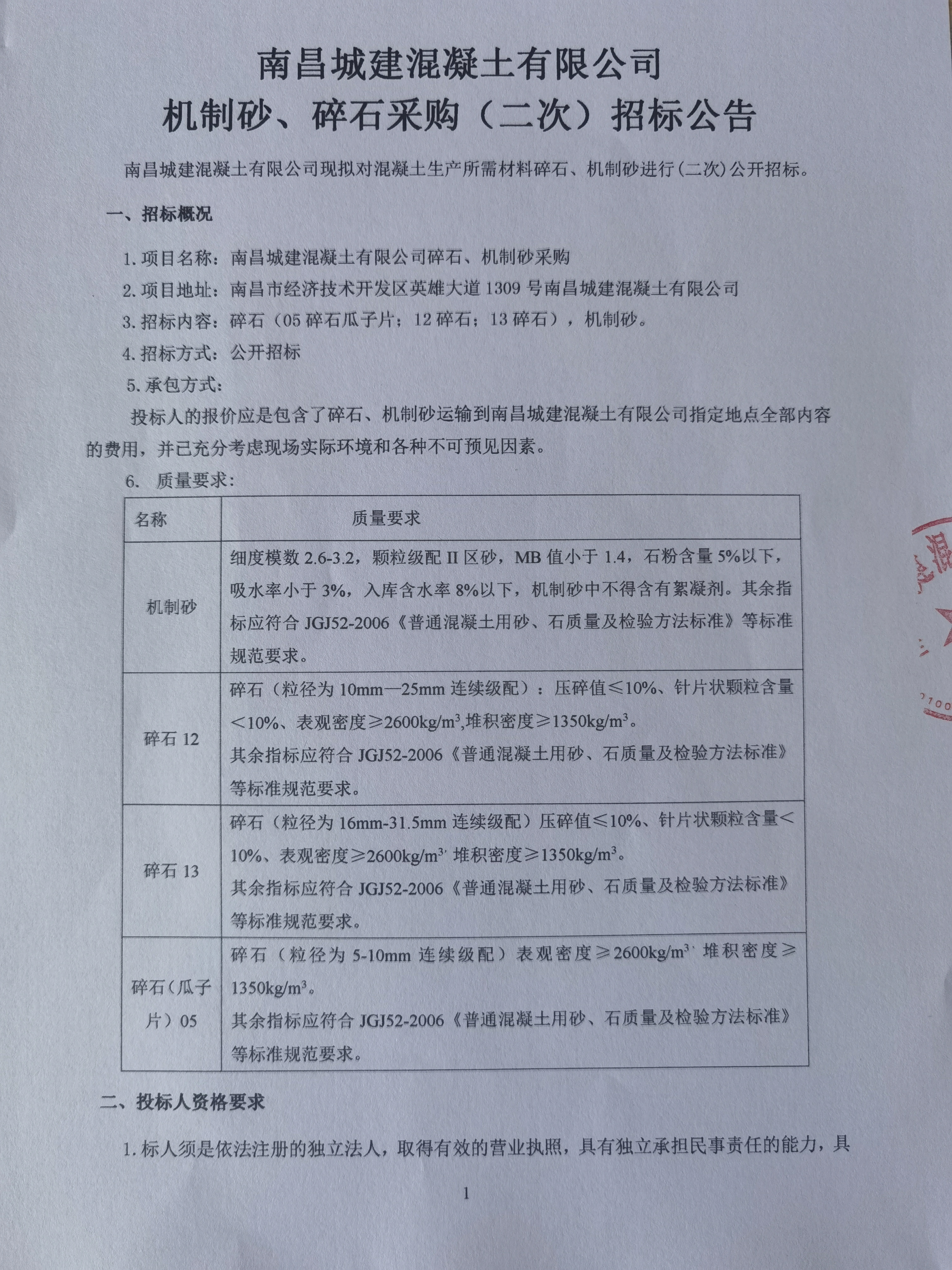 必赢亚州242.net混凝土有限公司现拟对混凝土生产所需材料碎石、机制砂进行(二次)公开招标。