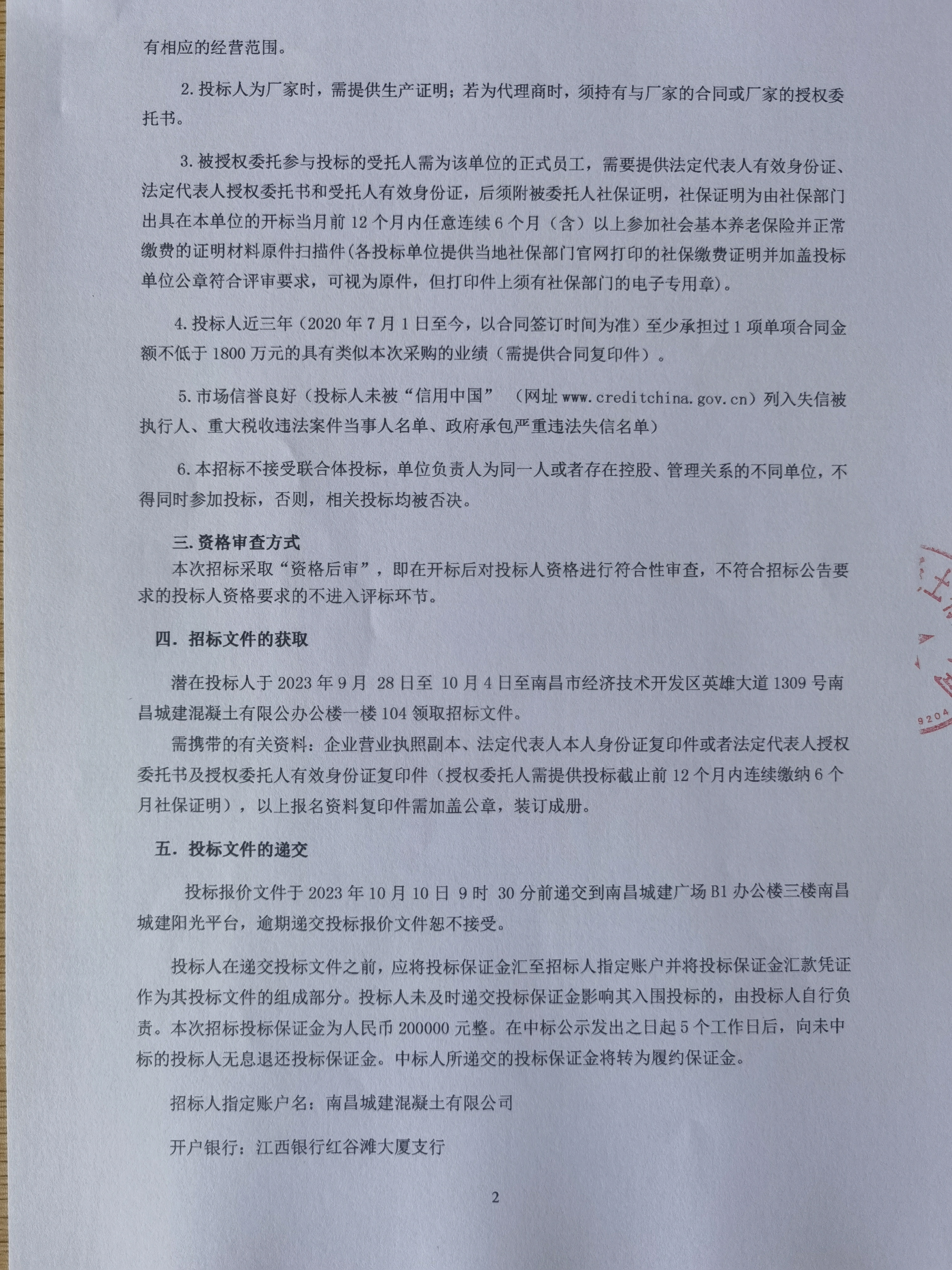 潜在投标人于2023年9月 28日至 10月4日至南昌市经济技术开发区英雄大道1309号必赢亚州242.net混凝土有限公办公楼一楼104领取招标文件。