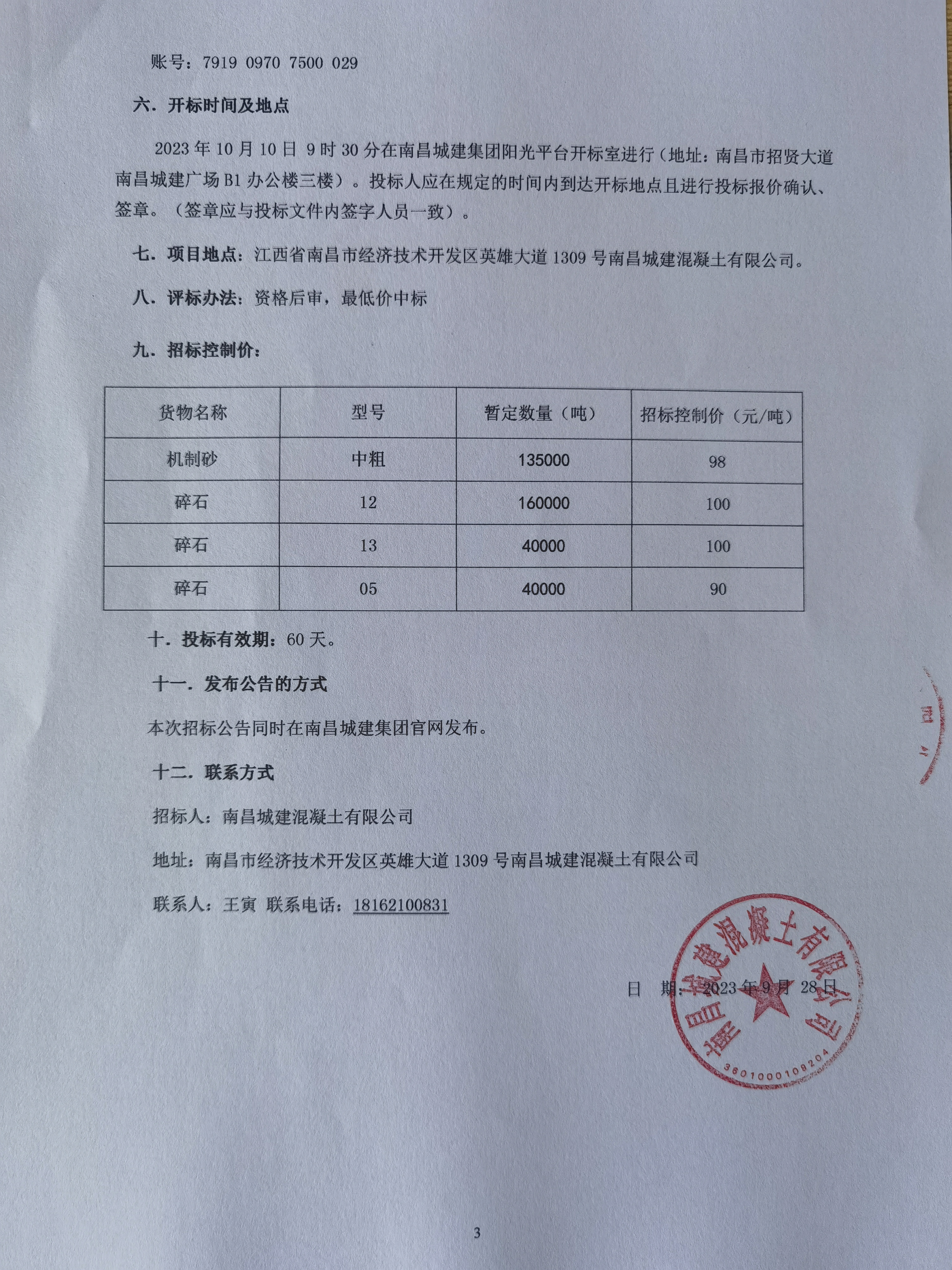 招标人指定账户名:必赢亚州242.net混凝土有限公司