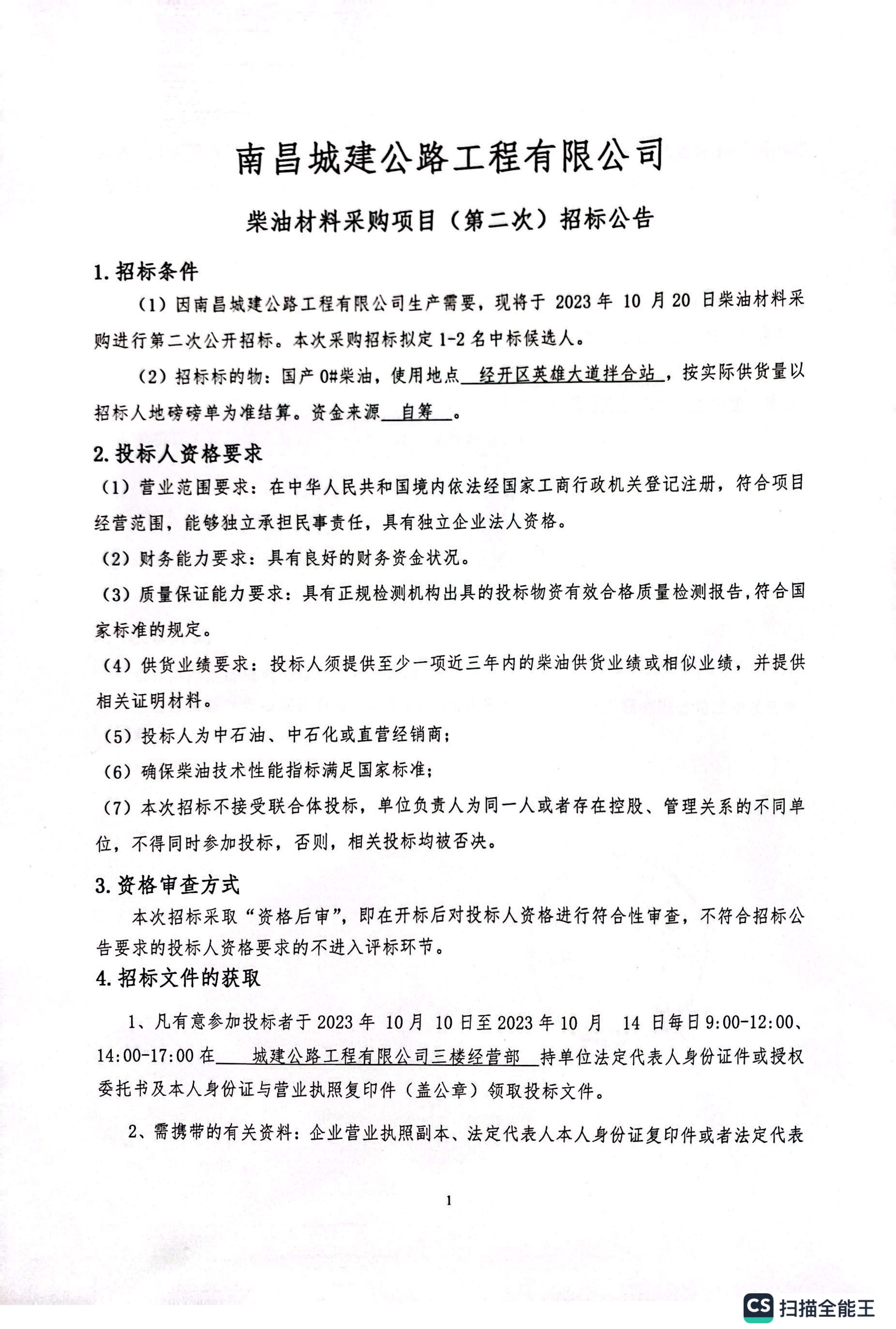 (1)因必赢亚州242.net公路工程有限公司生产需要,现将于 2023年 10 月20 日柴油材料采购进行第二次公开招标。本次采购招标拟定1-2名中标候选人。