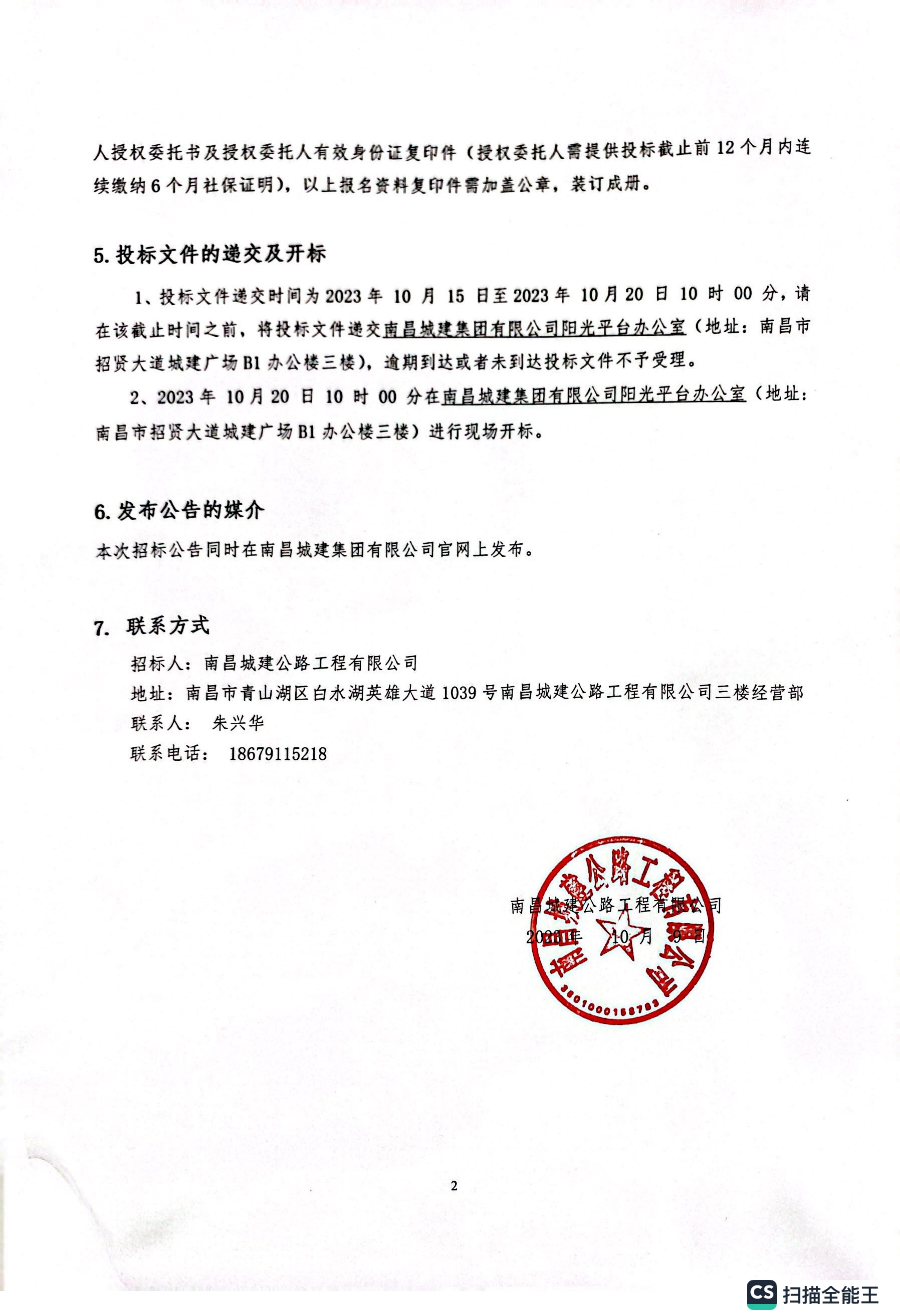 2、2023年 10月20 日 10 时 00 分在必赢亚州242.net集团有限公司阳光平台办公室(地址:南昌市招贤大道城建广场B1办公楼三楼)进行现场开标。