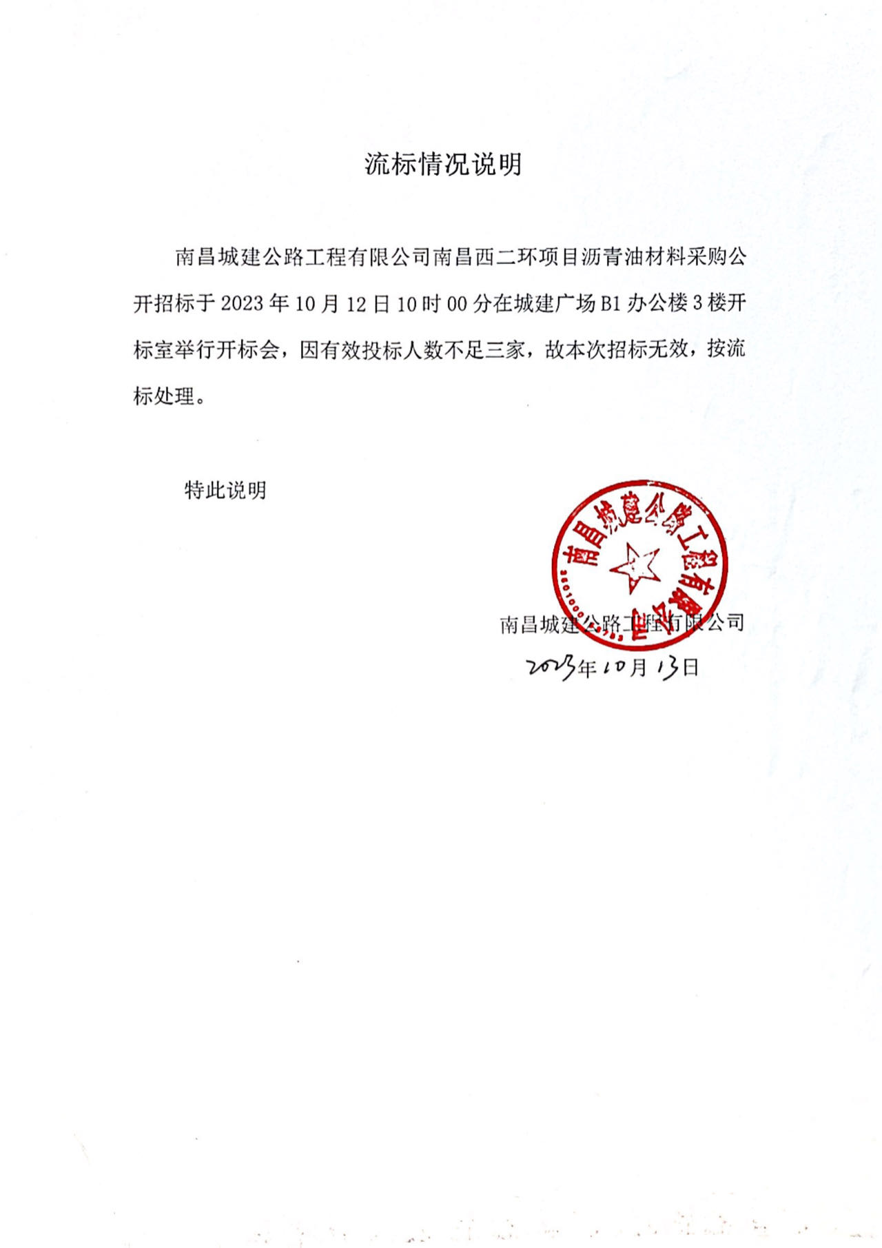 必赢亚州242.net公路工程有限公司南昌西二环项目沥青油材料采购公开招标于2023年10月12日10时00分在城建广场B1办公楼3楼开标室举行开标会,因有效投标人数不足三家,故本次招标无效,按流标处理。