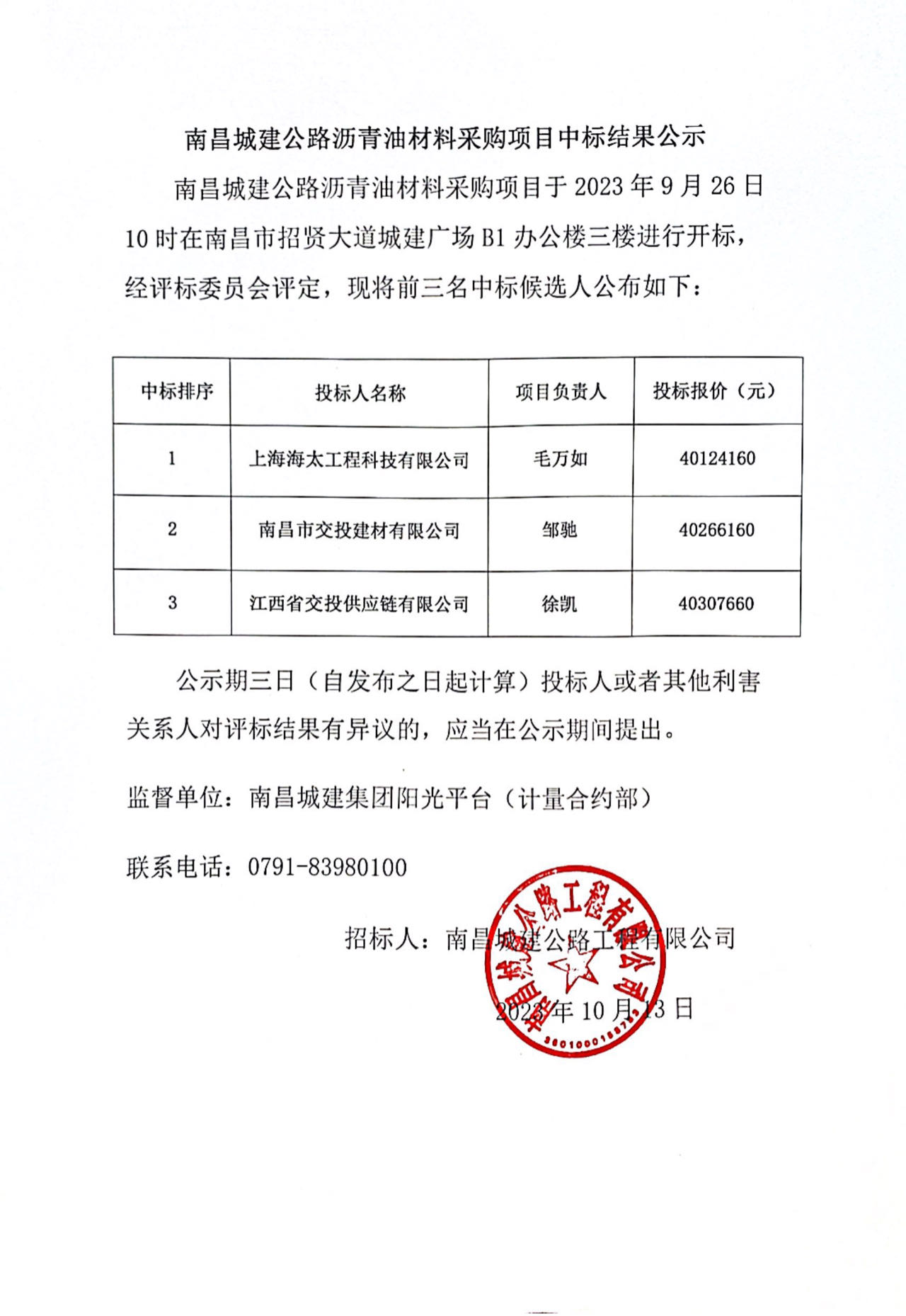 必赢亚州242.net公路沥青油材料采购项目于2023年9月26日10时在南昌市招贤大道城建广场B1办公楼三楼进行开标,经评标委员会评定,现将前三名中标候选人公布如下:
