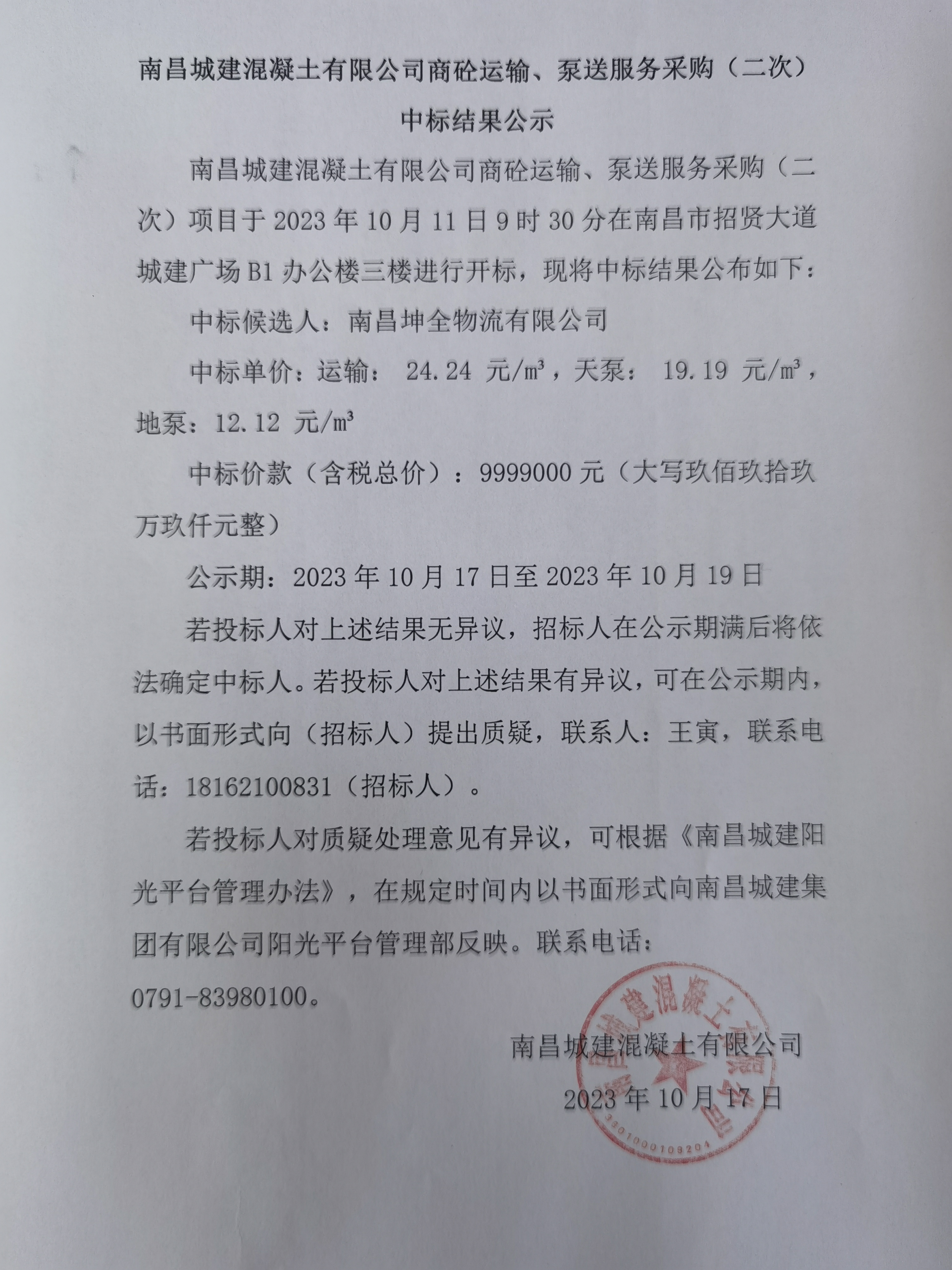 必赢亚州242.net混凝土有限公司商砼运输、泵送服务采购(二次)项目于2023年10月11日9时30分在南昌市招贤大道城建广场B1办公楼三楼进行开标,现将中标结果公布如下: