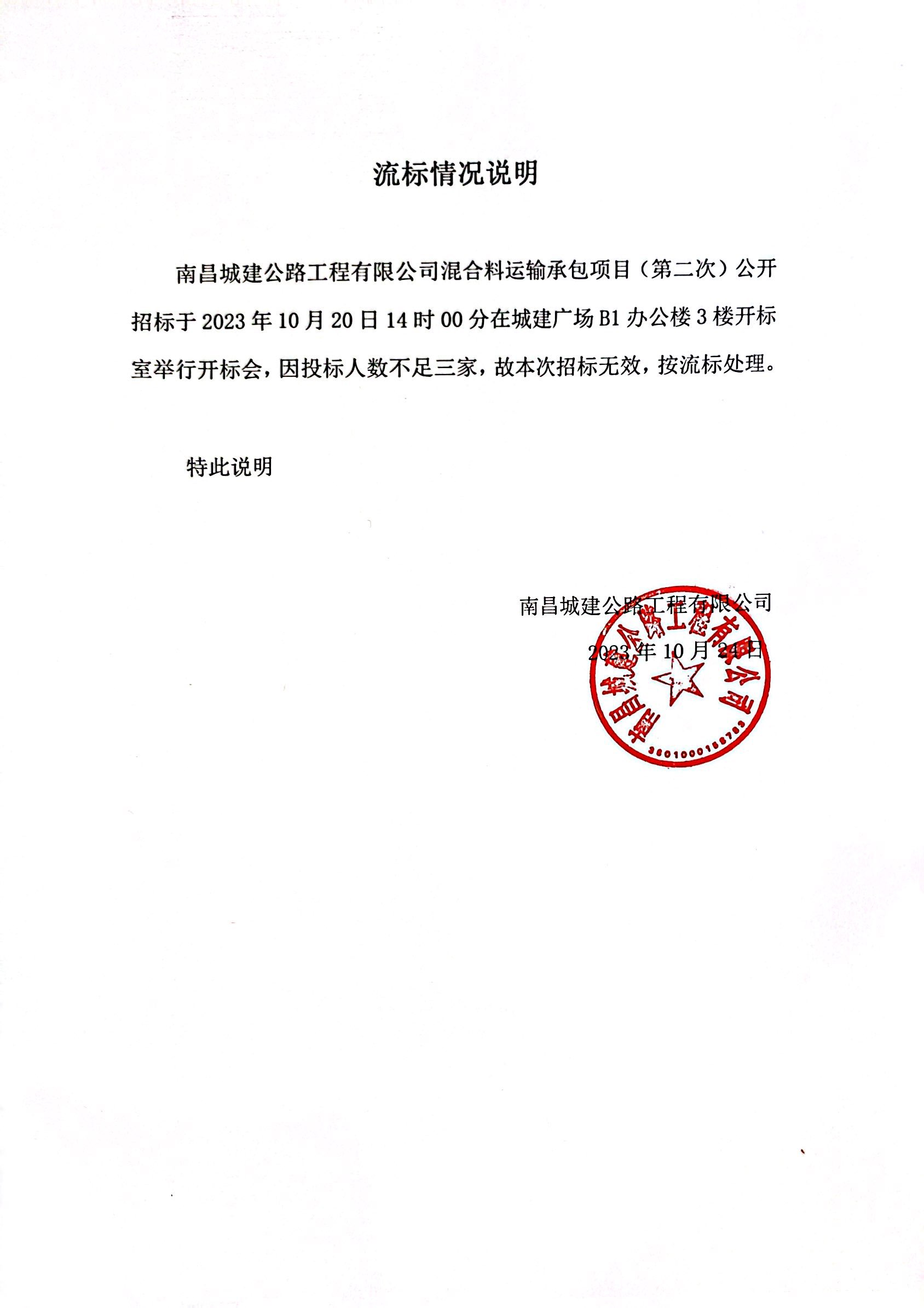 必赢亚州242.net公路工程有限公司混合料运输承包项目(第二次)公开招标于2023年10月20日14时00分在城建广场B1办公楼3楼开标室举行开标会,因投标人数不足三家,故本次招标无效,按流标处理。