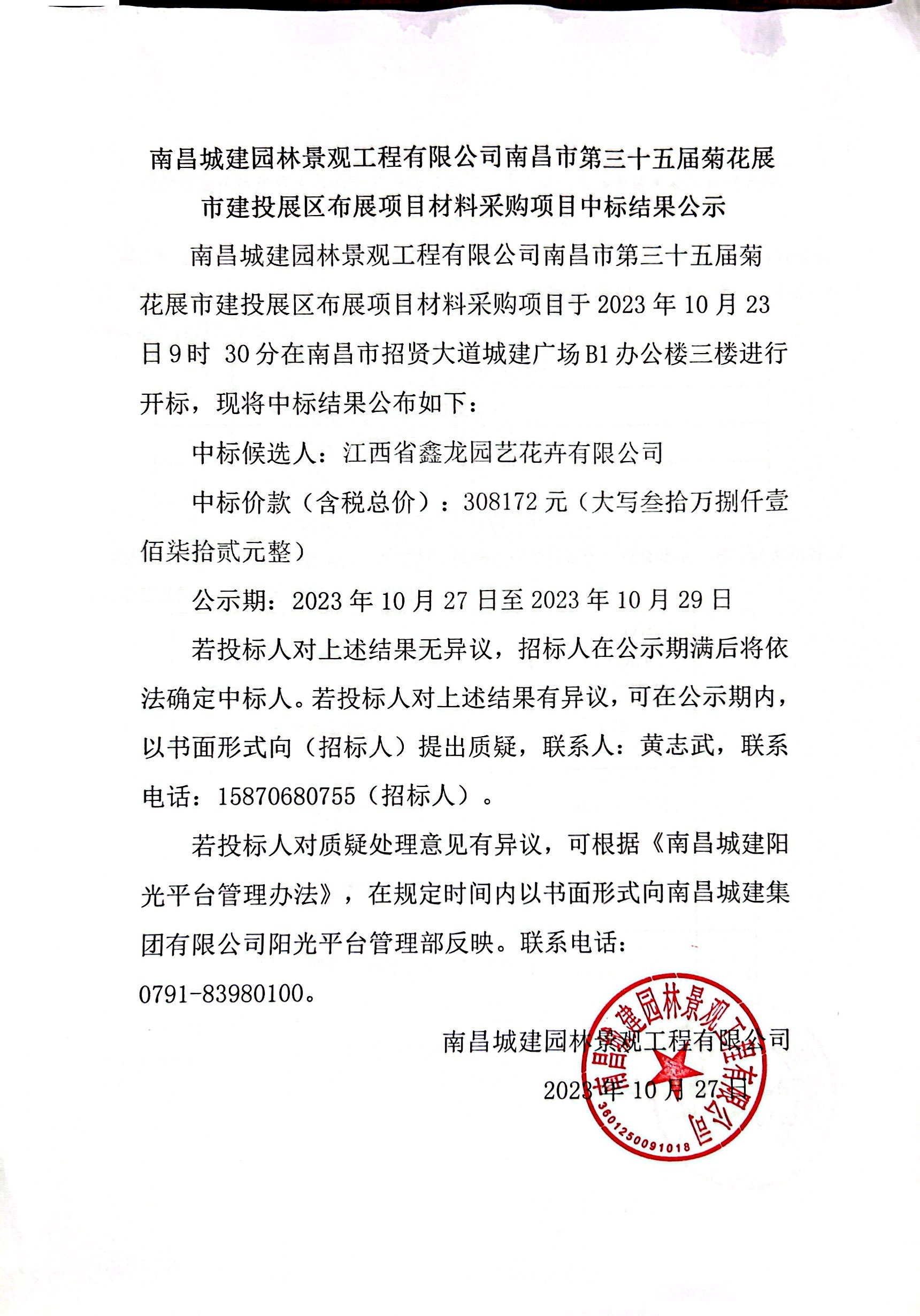 必赢亚州242.net园林景观工程有限公司南昌市第三十五届菊花展市建投展区布展项目材料采购项目于2023年10月23日9时 30分在南昌市招贤大道城建广场B1办公楼三楼进行开标,现将中标结果公布如下: