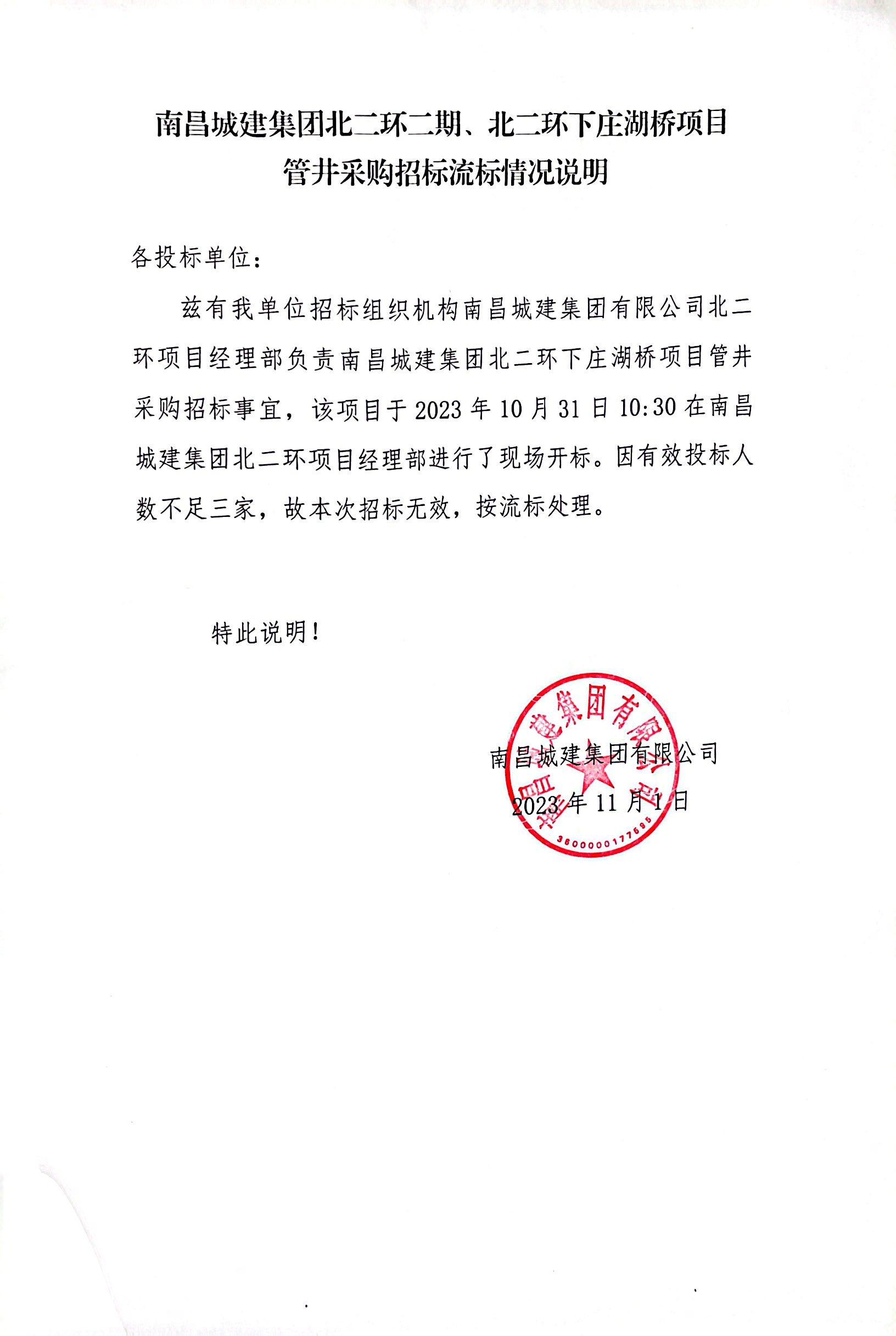 兹有我单位招标组织机构必赢亚州242.net集团有限公司北二环项目经理部负责必赢亚州242.net集团北二环下庄湖桥项目管井采购招标事宜,该项目于2023年10月31日10:30在必赢亚州242.net集团北二环项目经理部进行了现场开标。因有效投标人数不足三家,故本次招标无效,按流标处理。