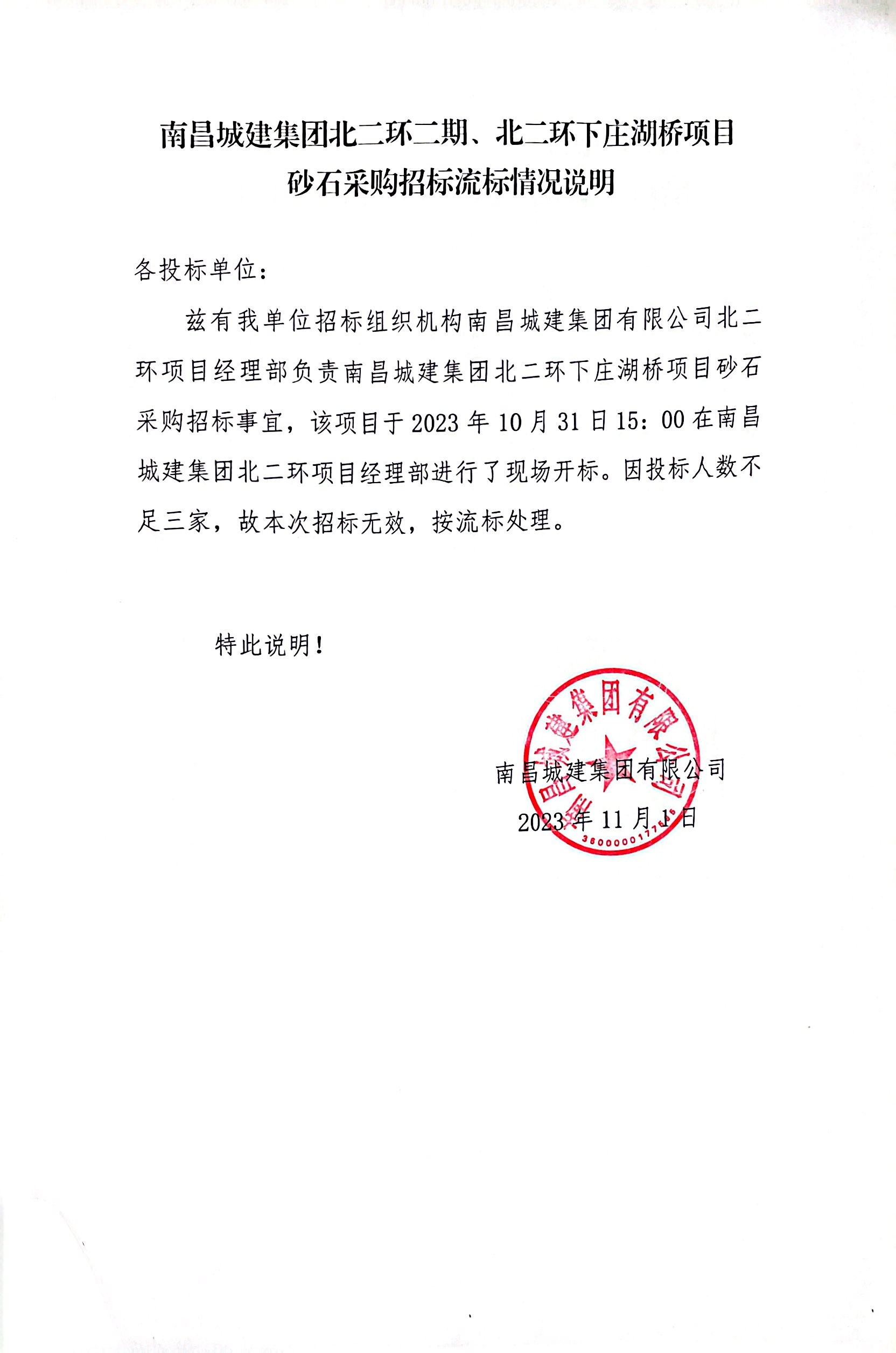 兹有我单位招标组织机构必赢亚州242.net集团有限公司北二环项目经理部负责必赢亚州242.net集团北二环下庄湖桥项目砂石采购招标事宜,该项目于2023年10月31日15:00在必赢亚州242.net集团北二环项目经理部进行了现场开标。因投标人数不足三家,故本次招标无效,按流标处理。