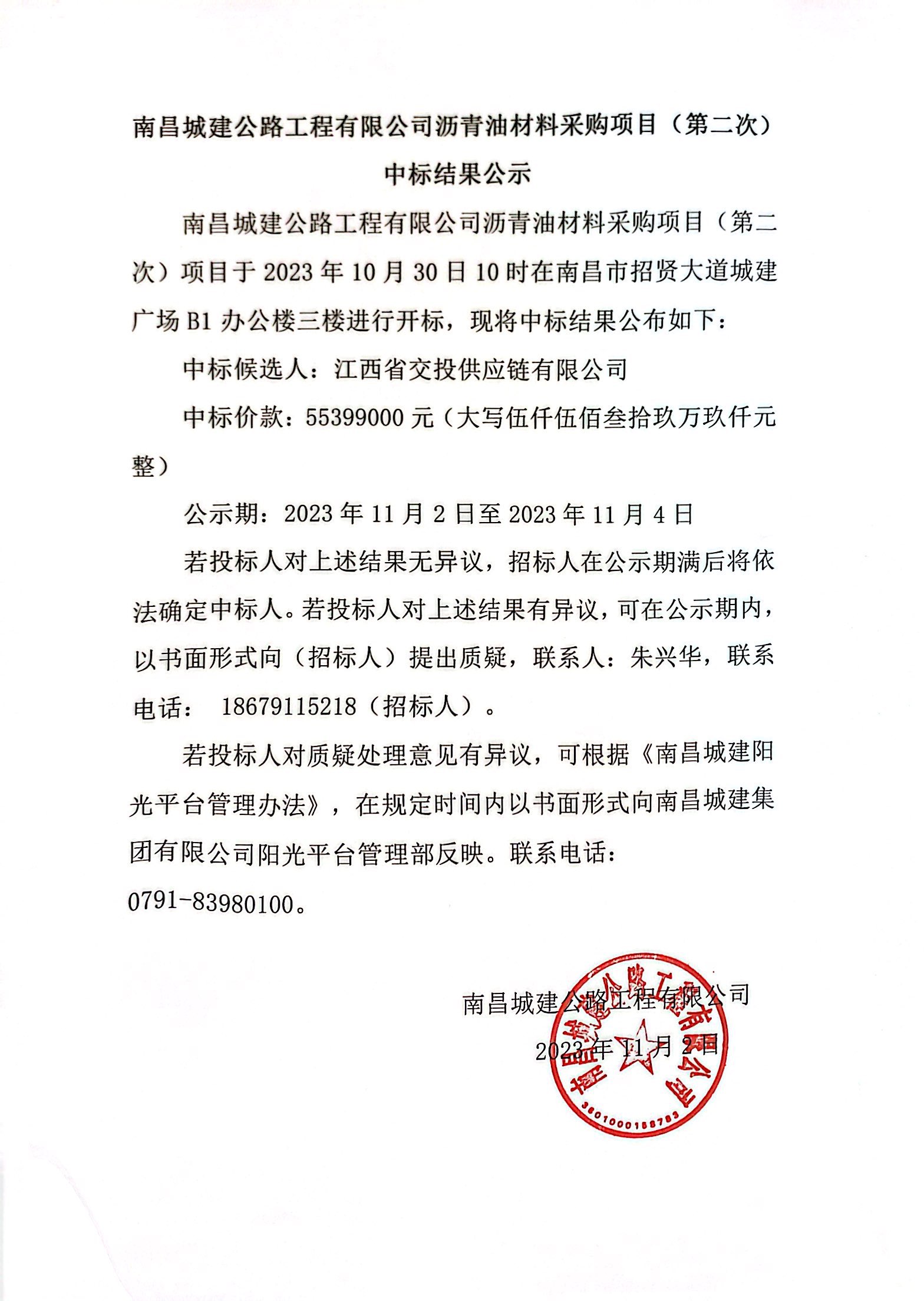 必赢亚州242.net公路工程有限公司沥青油材料采购项目(第二次)项目于2023年10月30日10时在南昌市招贤大道城建广场B1办公楼三楼进行开标,现将中标结果公布如下: