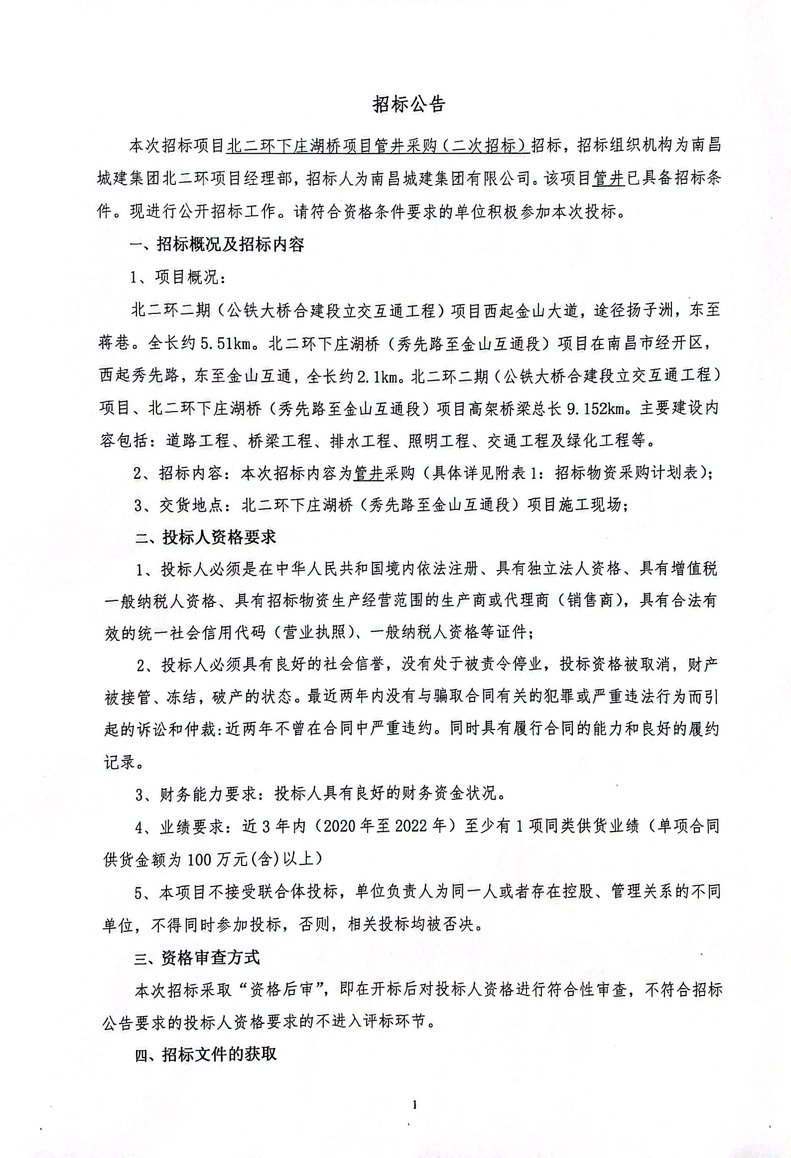 本次招标项目北二环下庄湖桥项目管井采购(二次招标)招标,招标组织机构为必赢亚州242.net集团北二环项目经理部,招标人为必赢亚州242.net集团有限公司。该项目管井已具备招标条件。现进行公开招标工作。请符合资格条件要求的单位积极参加本次投标。