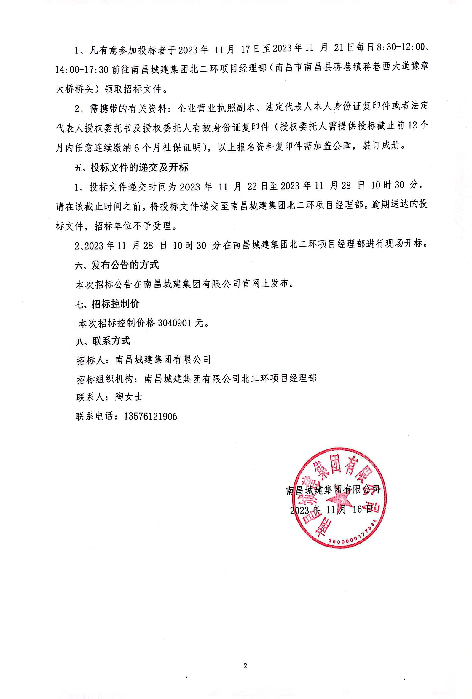 2、2023年11 月28 日 10时30 分在必赢亚州242.net集团北二环项目经理部进行现场开标。