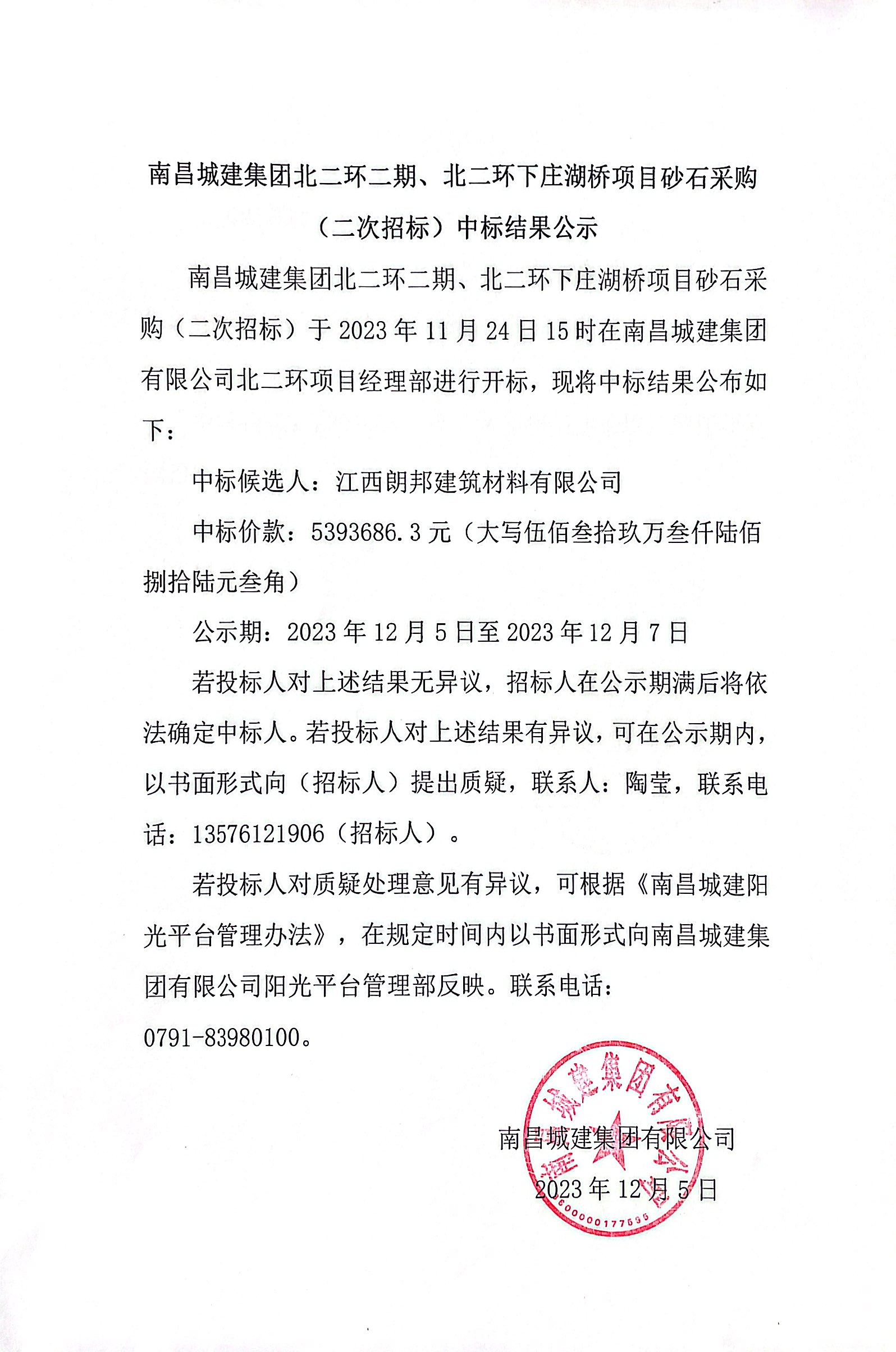 必赢亚州242.net集团北二环二期、北二环下庄湖桥项目砂石采购(二次招标)于2023年11月24日15时在必赢亚州242.net集团有限公司北二环项目经理部进行开标,现将中标结果公布如下:
