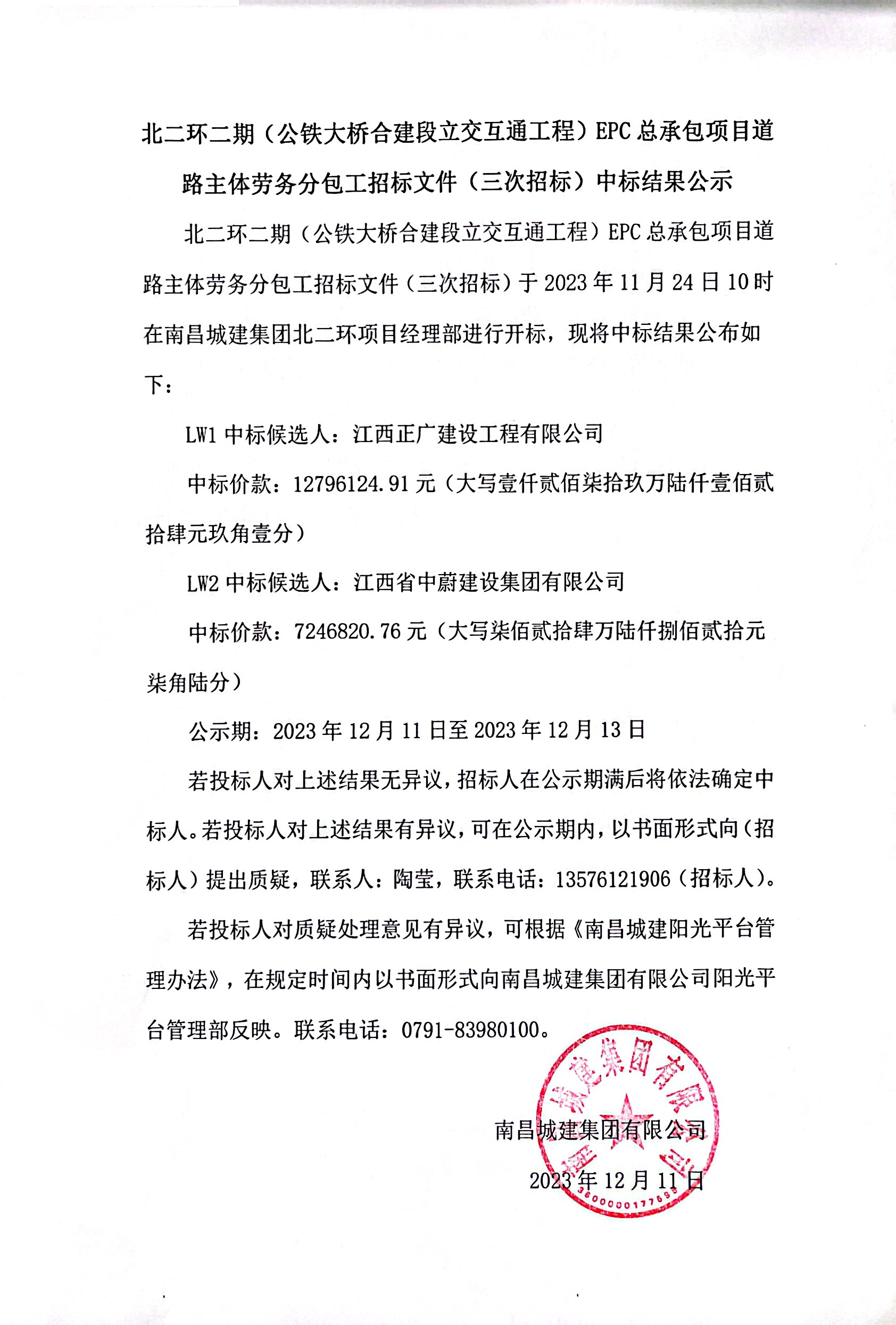 北二环二期(公铁大桥合建段立交互通工程)EPC总承包项目道路主体劳务分包工招标文件(三次招标)于2023年11月24日10时在必赢亚州242.net集团北二环项目经理部进行开标,现将中标结果公布如下: