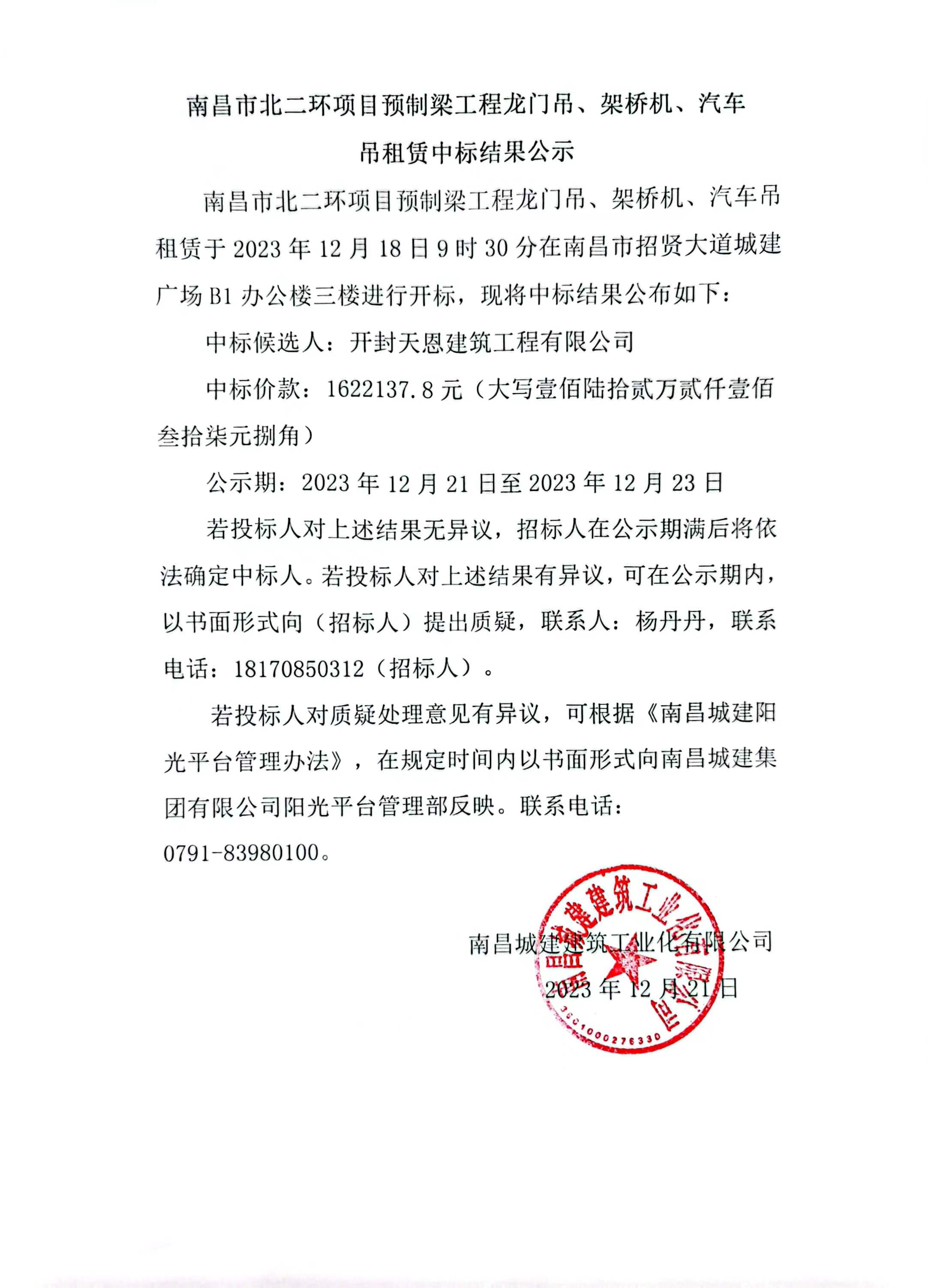 南昌市北二环项目预制梁工程龙门吊、架桥机、汽车吊租赁于2023年12月18日9时30分在南昌市招贤大道城建广场B1办公楼三楼进行开标,现将中标结果公布如下:
