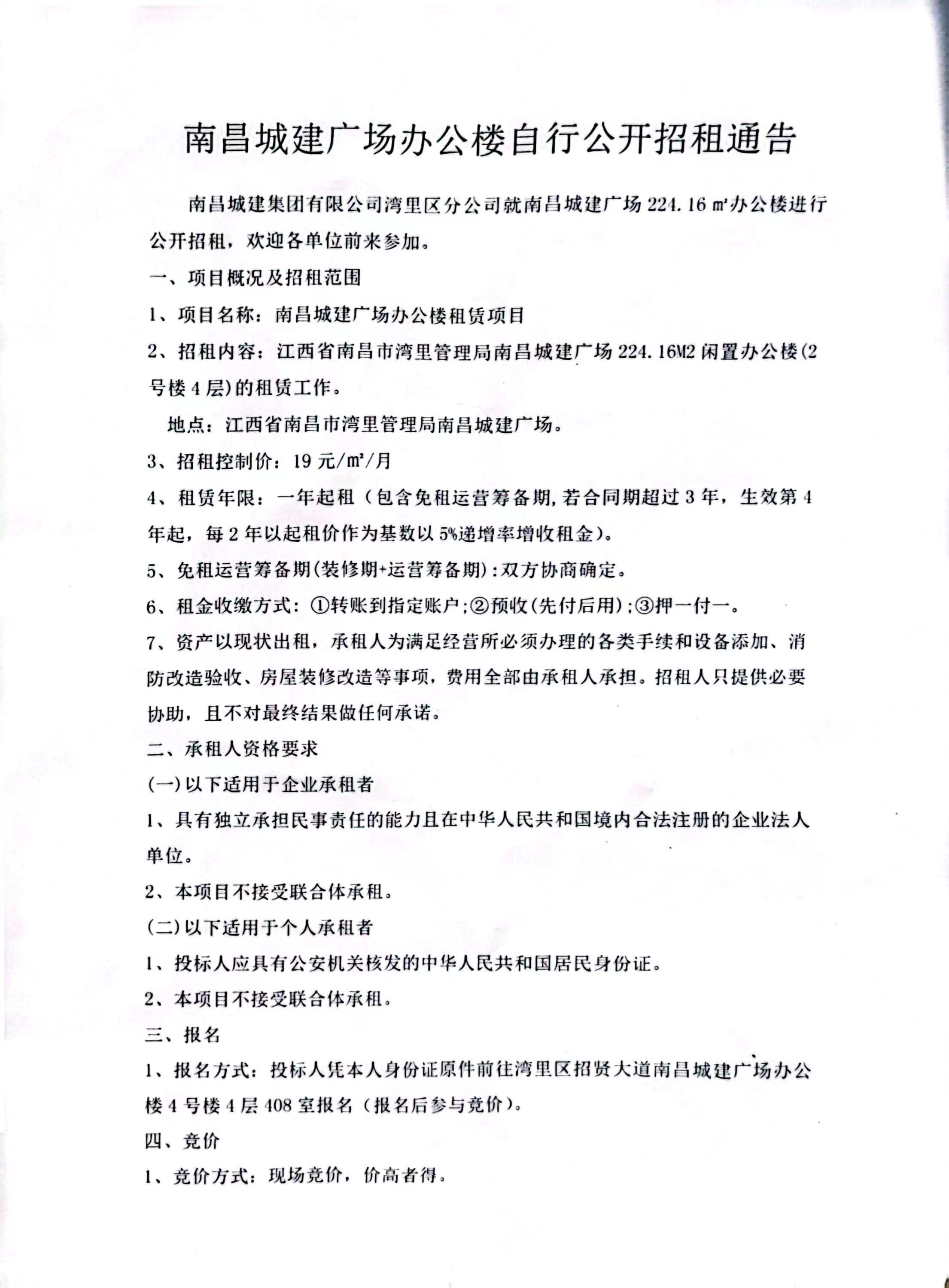 2、招租内容:江西省南昌市湾里管理局必赢亚州242.net广场224.16M2闲置办公楼(2号楼4层)的租赁工作。