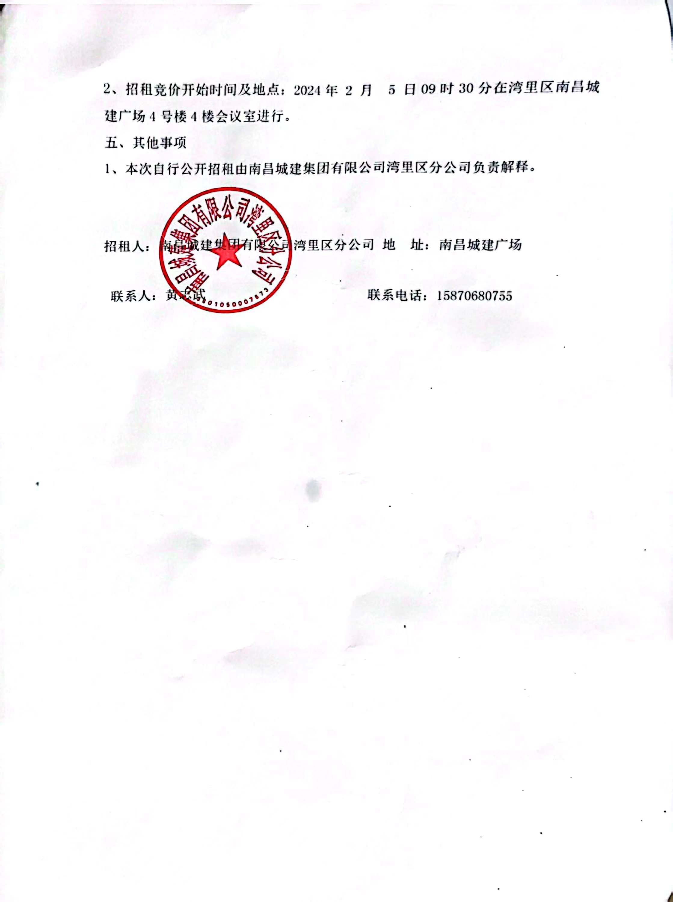 2、招租竞价开始时间及地点:2024年 2 月 5 日09时30分在湾里区必赢亚州242.net广场4号楼4楼会议室进行。
