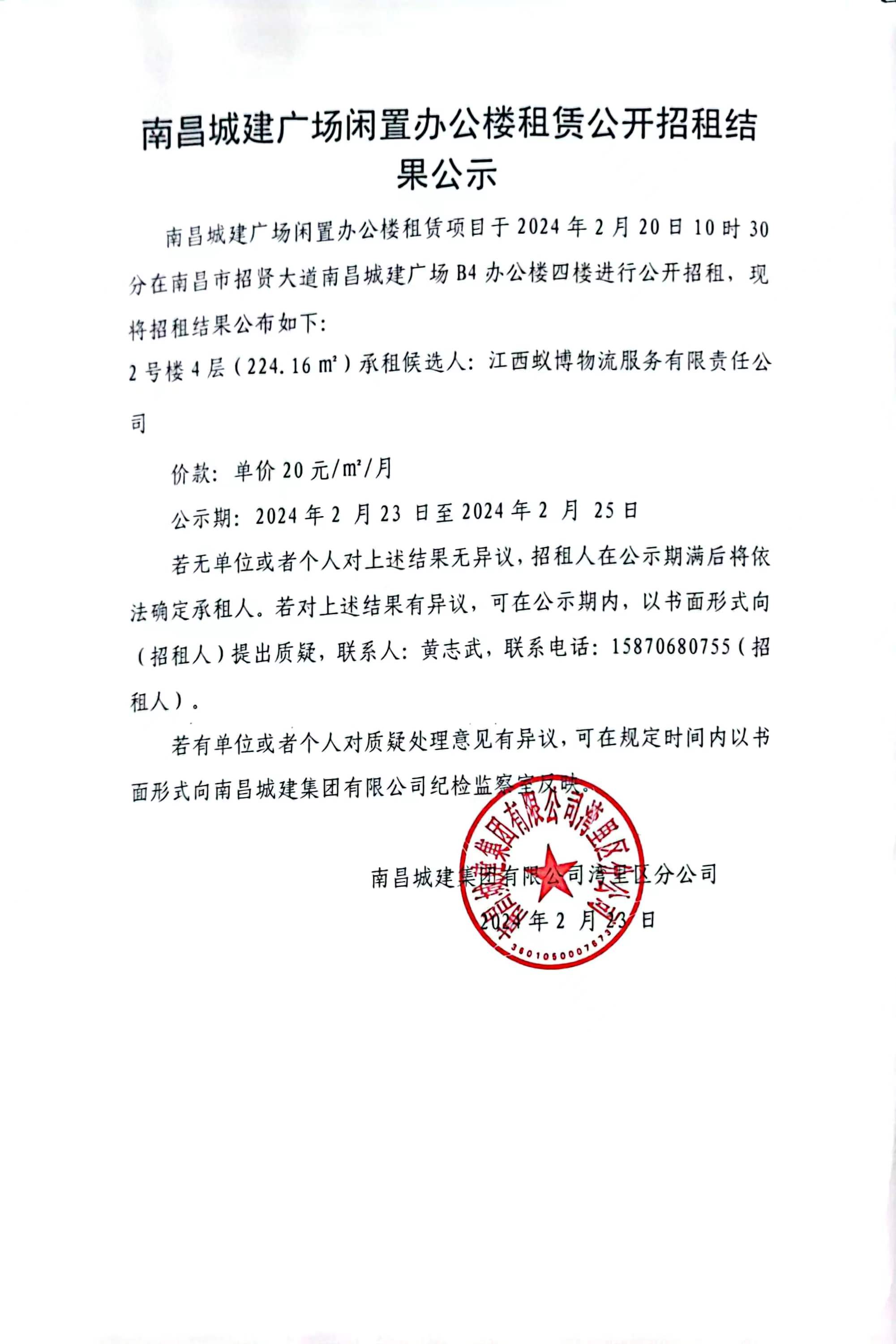 必赢亚州242.net广场闲置办公楼租赁项目于2024年2月20日10时30分在南昌市招贤大道必赢亚州242.net广场B4办公楼四楼进行公开招租,现将招租结果公布如下: