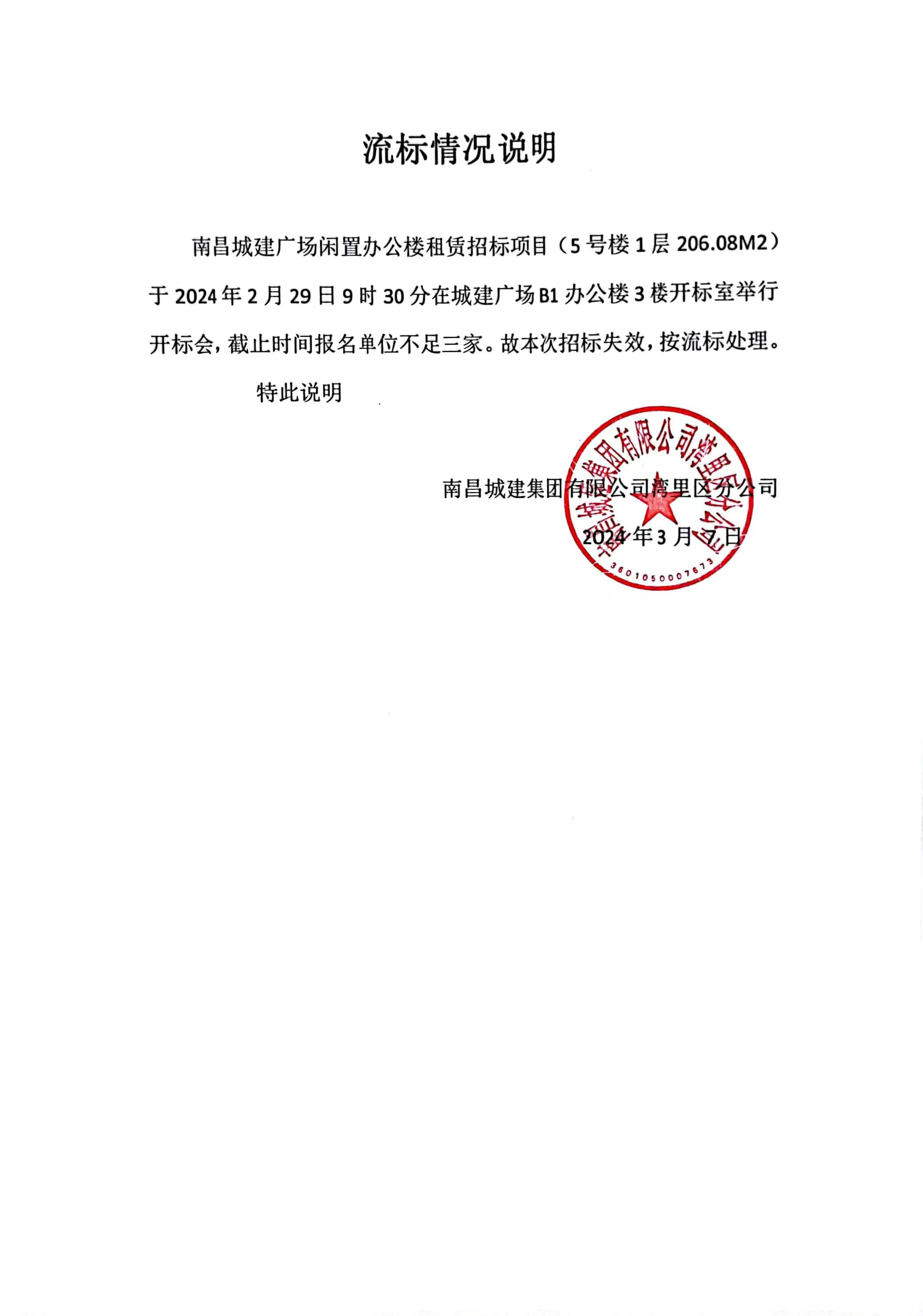 必赢亚州242.net广场闲置办公楼租赁招标项目(5号楼1层206.08M2)于2024年2月29日9时30分在城建广场B1办公楼3楼开标室举行开标会,截止时间报名单位不足三家。故本次招标失效,按流标处理。